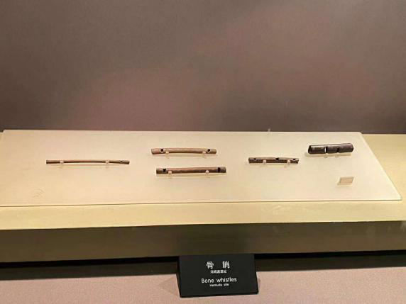 这一展厅则主要展现河姆渡先民的信仰及文化艺术生活。这其中最吸引同学们目光的便是距今7000年之久的“陶埙”和“骨哨”。相传,在新时期时代人们常在石头上穿孔系绳,制成名为“石流星”的狩猎工具。这种狩猎工具在高速运动中与气流相互作用发出“哨音”,好奇的人们把它拿来吹,就这样,这种狩猎工具就慢慢的演变成了“埙”。