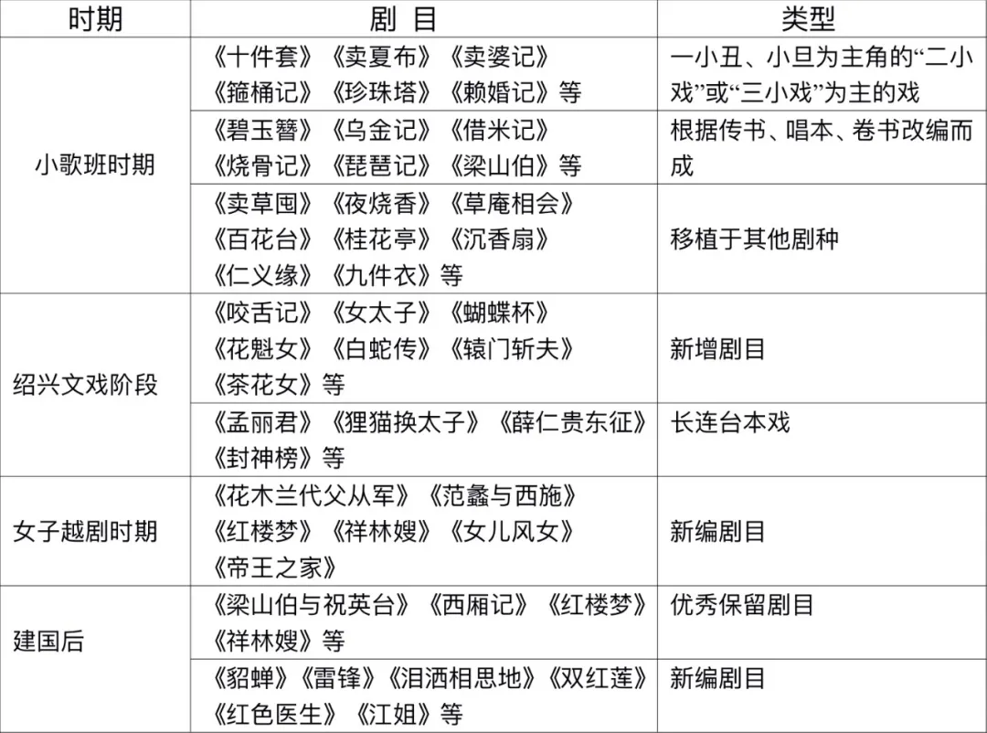 越剧——中国第二大剧种,有第二国剧之称。越剧的根脉是田头歌唱,由嵊州民间的山歌小调和宣卷佛曲有机结合而成。1863年前后,甘霖镇马塘村金其炳等部分农民,利用[四合宫调]和田头歌唱积累的经验,沿门挨户去卖唱以求施舍,这便是越剧前身的初级阶段“沿门唱书”,由于其演唱形式简单易学,且能解决实际困难,在嵊州及其周边地区迅速流行起来。1897年春节,嵊州唱书艺人金芝堂等人进入余杭县茶馆表演,因为表演时演唱者围着舞台上的小桌子演唱,便得名“走台书”。1889年,金芝堂等人改进唱腔,吸收地方戏曲精华,创造了[嘎令调],为以后越剧的诞生奠定了基础。1906年2月27,嵊州唱书艺人李世全等人邀请了一大批民间艺人,在东王村香火堂搭台组织了一场较为正式的演出,早期越剧“小歌班”就此诞生,这一天也成为了越剧的生日。而后越剧又经历了绍兴文戏、女子越剧等阶段,并不断吸收其他剧种的优点进行改良、改革,最终逐渐走向全国,走向世界,享誉海内外。
