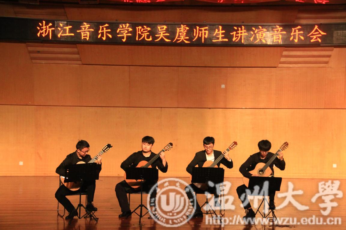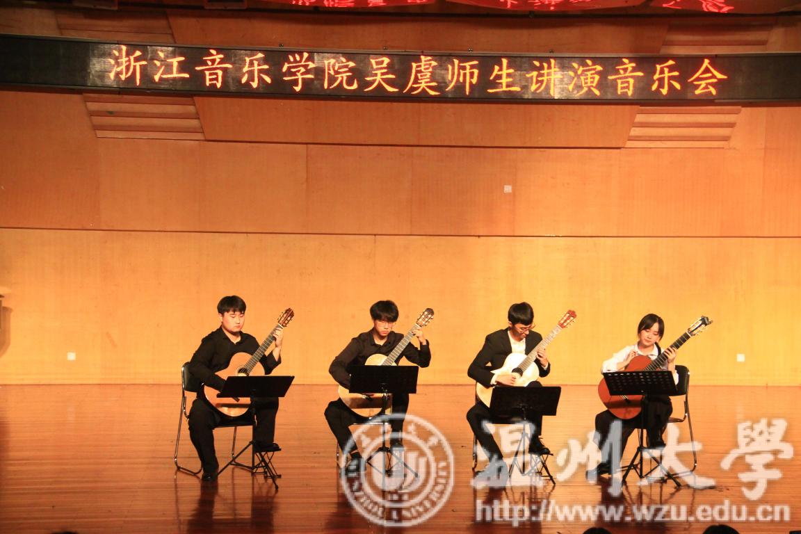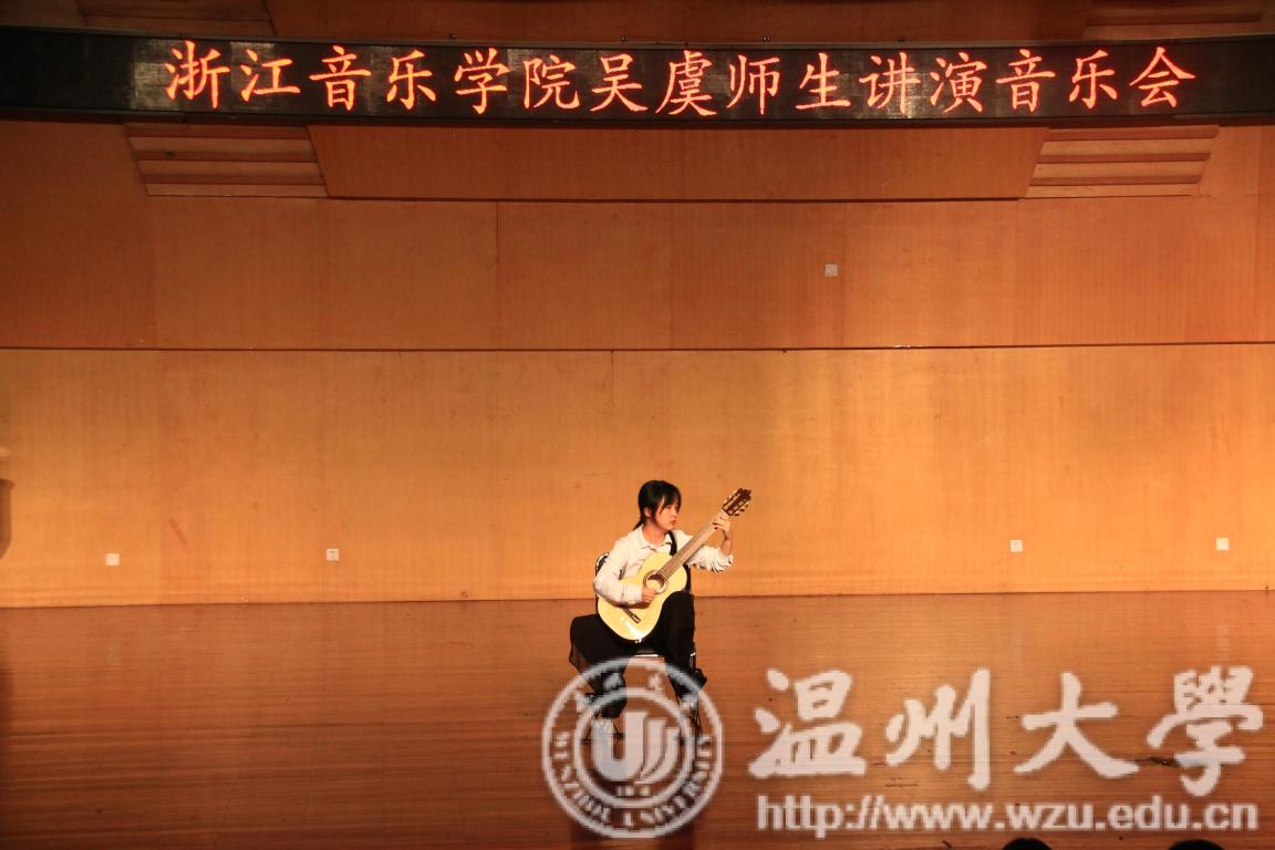 音乐会以吴虞老师的独奏拉开序幕,吉他声婉转而悠扬,仿佛诉说着对生活的向往,带有强烈的南美洲民间色彩。接下来是由江海延演奏华金罗德里戈的《三首西班牙乐曲》,只见舒缓的音乐响起,演奏者拨动吉他的弦,奏出弯曲的平行线,华光从缝隙倾限,失去在不经意间,让人心旷神怡。一曲落幕,一首极富节奏感的小奏鸣曲迎面而来,是由浙江国产成人电影