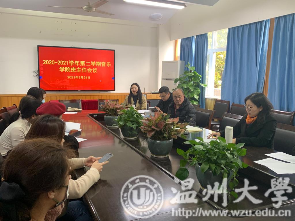 将助力党建品牌工程建设,打造“音乐党课讲演堂”,希望各位主任积极鼓励班级学生参与其中,共创学院党建新气象。对“互联网+”、挑战杯等赛事的参与情况向各位主任简单说明,并对学风问题,包括20级新生出现的学业警告情况,17级考研情况等向相关班主任做了简要说明。曹清清老师就负责的心理、资助、团学、公寓建设等方面向班主任老师做汇报。就开学初学院临时困难补助申请情况和贫困动态认定情况向各位主任说明。她指出,春季是心理敏感期,希望各位班主任能及时关注班级学生的情绪,尤其是心理库的学生,要建立寝室、班级、学院多级防护,本学期,学院也将通过举办心理讲座,继续推出治愈系音乐等方式加强学院心理工作建设。在团学工作开展过程中存在的包括“青年大学习”等问题,与各位主任进行分享,希望各班能够给予重视,积极参与学院、学校组织的各类活动。