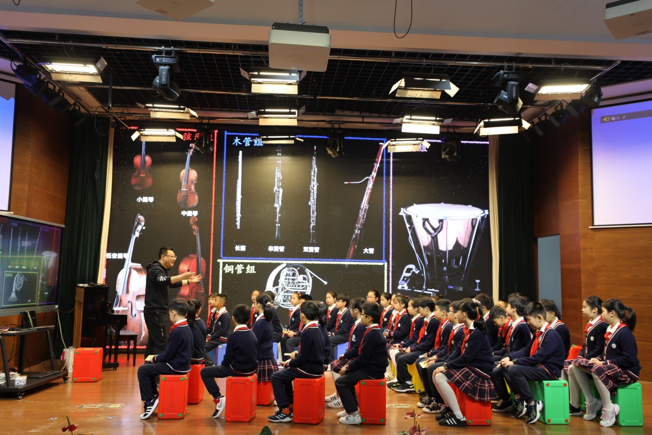 3月31日上午第一节课是李嵩老师带来的交响童话《彼得与狼》,为了更好的让同学了解交响乐,老师先带同学们认识乐器,运用多次提问的方式加深学生们的印象。李嵩老师语言幽默,课堂上学生发言十分积极,师生互动也十分有趣,半节课下来,学生已经对乐器音乐表达也有了一定的了解。