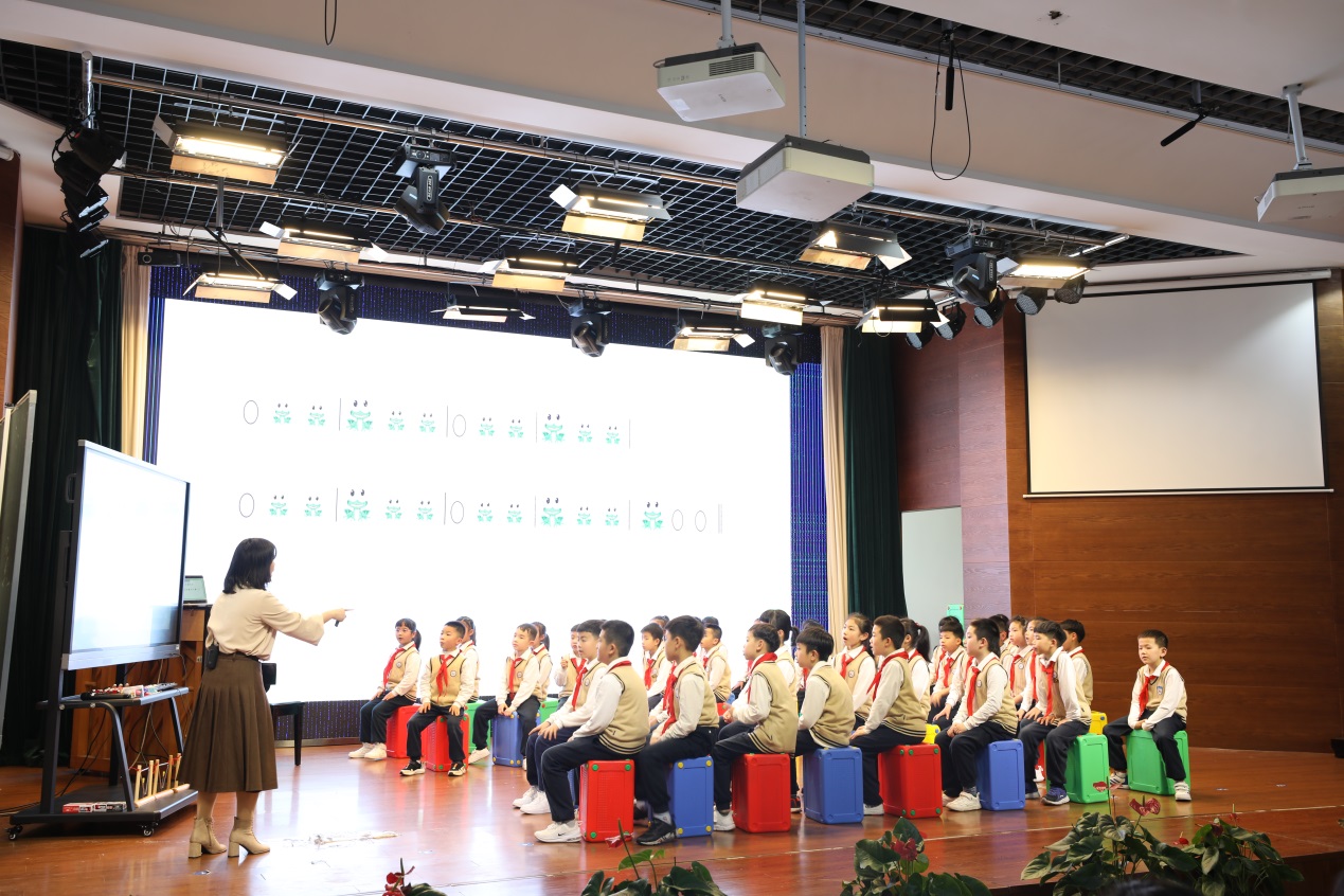 第二节课是由南薇薇老师携三年(4)班的同学们带来《乒乓变奏曲》。南老师通过游戏互动方式进行身体节拍律动从而导出本节课核心的节奏型,并循序渐进进行扩展。南老师上课热情亲切有趣,擅长抓住同学们的心理,对其进行鼓励表扬式教学,调动学生上课的积极性,整堂课氛围轻松活跃。