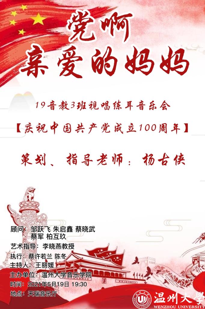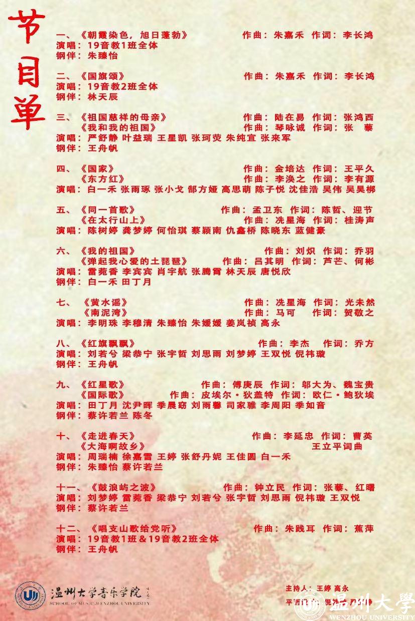 为庆祝中国共产党成立100周年在温州大学天瑞音乐厅举办了两场视唱音乐会,分别是“红歌传唱”视唱音乐会和“党啊亲爱的妈妈”视唱练耳音乐会。“红歌传唱”视唱音乐会由19音教1班、19音教2班携手演出,指导和策划为国产成人电影-免费看色情影片