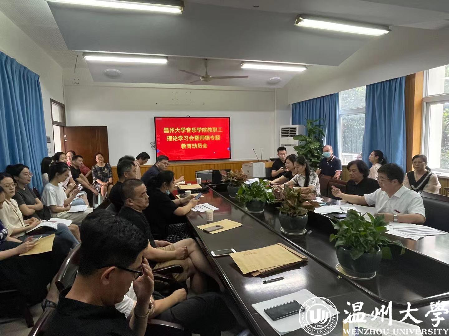 在音乐楼203室召开教职工理论学习会暨师德专题教育动员会,学校党委副书记杨立淮、学院院长邹跃飞、学院党委书记朱启鑫、学院副院长蔡军、学院副书记蔡晓武以及学院全体教职工参加会议,会议由学院党委书记朱启鑫主持。