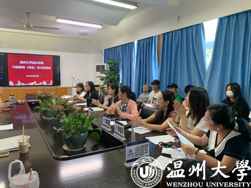 会议伊始,实习负责人李葳老师对本次18级音乐学(师范)学生实习工作进行了总结讲话,肯定实习学生们的优异表现,并对学生们的将来寄予了厚望。随后,18音表班级叶豫丹同学作为学生代表进行了实习总结发言;18音教班级叶婧婧同学作为绣山中学实习小组组长,徐双双同学作为温州市第二外国语学校实习小组组长,俞婷同学作为温州大学城附属学校实习小组组长,袁晓庆同学作为南浦实验中学实习小组组长,结合了音频、视频和PPT等,分别从实习学校的简介、教师团队、教学活动、班主任日常、个人感悟、工作内容、音乐课堂、实习收获等方面进行了精彩发言,他们不仅为大家展现了此次实习的成果,也是一次深刻全面的实习总结。