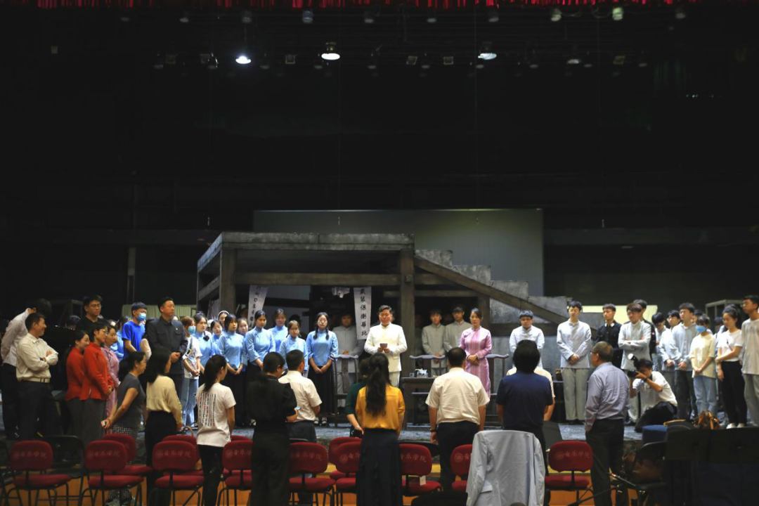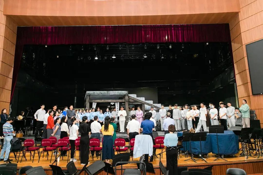 参演师生驻扎育英大礼堂,紧锣密鼓地排练节目,导演王湖泉教授现场坐阵指挥,力求以最好的状态展现温大风采。主演、群演、乐队通力合作,一遍又一遍地排练,揣摩人物心理和唱词动作调度。据了解,此次参加中国歌剧节时间紧、任务重,为了剧目更完美的呈现,剧组演职人员都在进行高强度地排练,哪怕是国庆假期,大家也都坚守在自己的工作岗位上为歌剧节全力以赴。大四的蓝展仪同学已是第三次参演《五星红旗》,“虽然正处于考编的关键时期,但收到通知后,我和室友毫不犹豫地就来了。这是一次非常难得的机会,演好《五星红旗》,弘扬国旗文化,不仅是我们的光荣更是使命。”蓝展仪说道。
