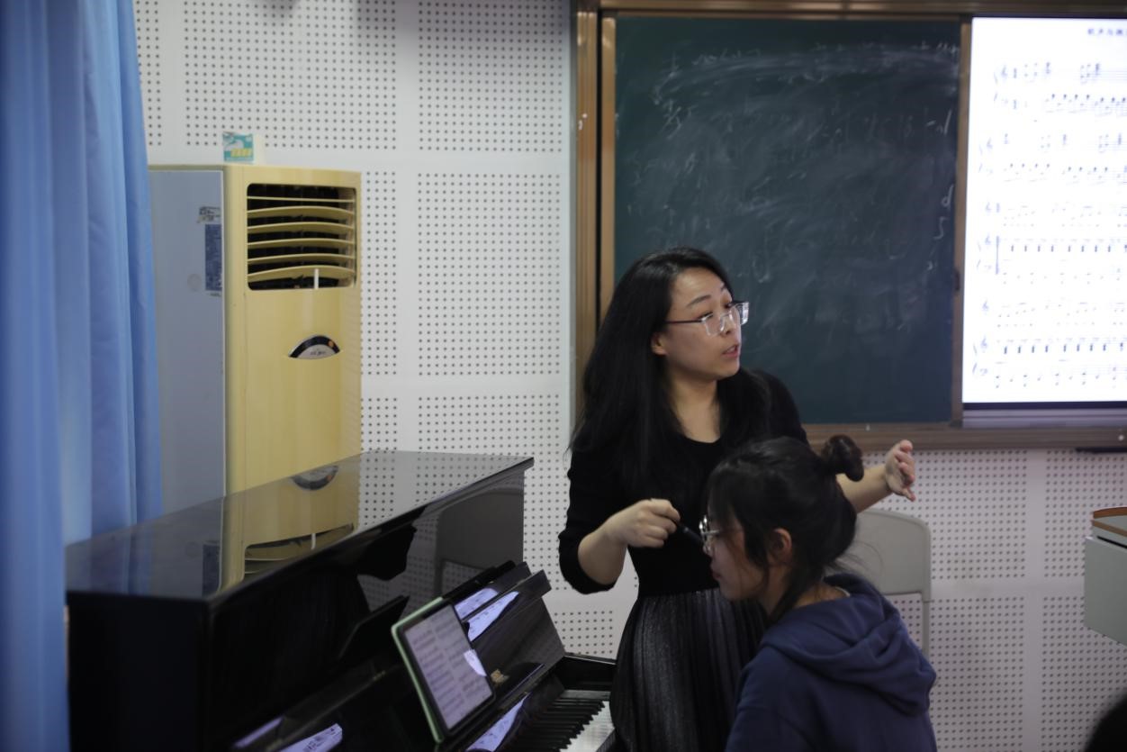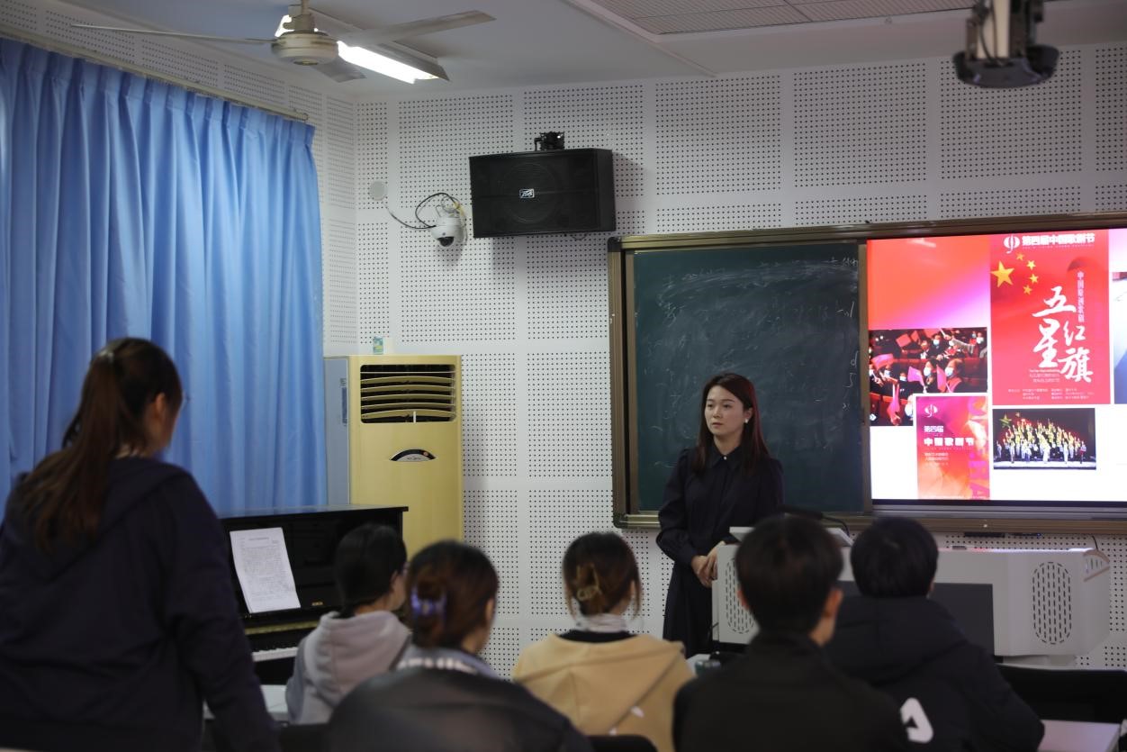 第四位陈露雯老师主要讲解柱式和弦伴奏音型的应用。她通过歌剧《五星红旗》导入课堂。学习如何进行柱式和弦的变形而让曲子更具推动性,同时让学生运用新学的知识分小组练习弹唱《一二三四歌》。
