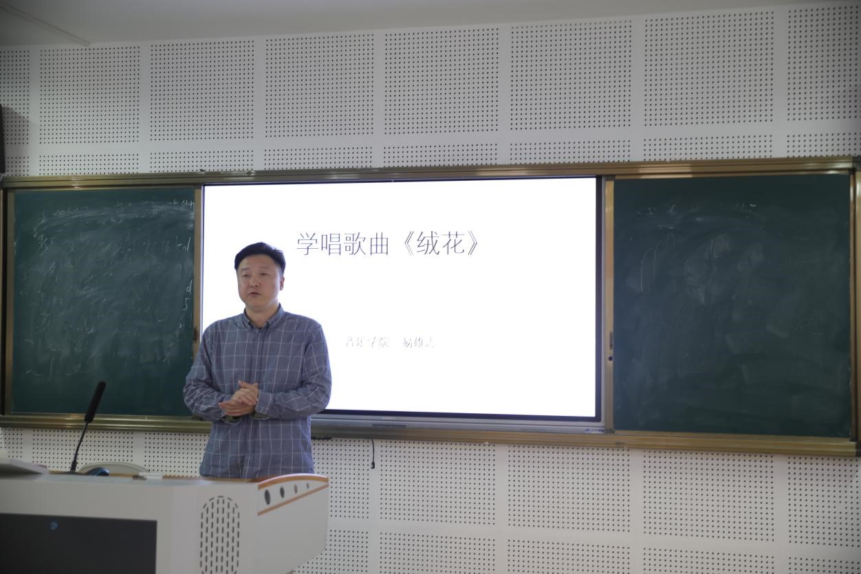 第二位易雄志老师通过讲解学习演唱歌曲《绒花》导入了歌唱的3个基本要素即呼吸、咬字和表演。接着通过影片介绍了歌曲的背景后进入课堂。通过学习基本要素使学生明白如何更好的进行演唱。