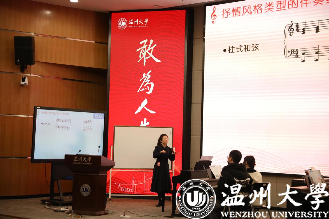 陈露雯老师的《钢琴即兴伴奏—抒情风格类型歌曲的实用编配》,将抒情风格的伴奏织体和表现手法等音乐知识与音乐实践紧密结合,教学内容丰富,教学手法新颖,注重融入课程思政元素,能够激发学生的发散性和创新型思维,创新设计教学过程,展示出教师自身扎实的学科知识、过硬的教学技能以及娴熟的课堂驾驭能力。得到了评委们的一致好评。