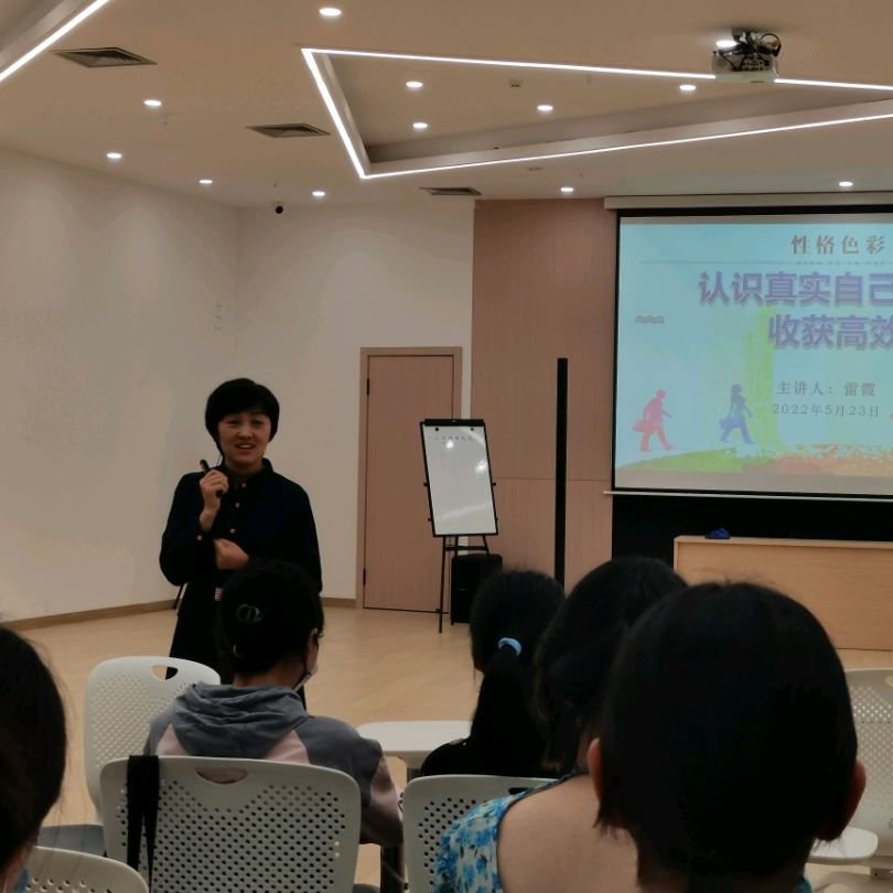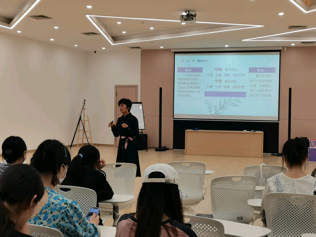 接着,雷老师与同学们详细辨析了性格和个性的概念,并介绍了红、蓝、黄、绿四种心理色彩以及其理论来源——希波克拉底的四液学说。首先同学们通过一个小测试,找到了自己所属的色彩。接着,雷老师通过生活中常见的例子分析了优劣,并用理论和实践相结合的方式帮助同学们如何认识自己与他人,从而实现有效的沟通。同时,雷老师提出了简单可行的提升方法,即不同性格的说话之道。她指出,红色性格讲故事,蓝色性格讲道理,黄色性格讲结果,绿色性格什么都可以。最后,针对同学们普遍的拖延症的问题,雷老师以四种心理色彩为依据,给出了相应的解决办法,帮助同学们认识真实的自己,收获幸福的人生。