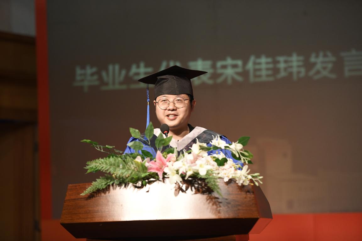 毕业生代表宋佳伟代表全体2022届毕业生发言”现在回忆起来,从本科到研究生,我在温州大学的七年时光就像做梦一般美好,今天我就要离开这个我深深爱着的学院,担起‘温大人’的名号向未来进发,母校对我们的栽培永生难忘,也希望同学们未来势如破竹,祝母校再创辉煌!”