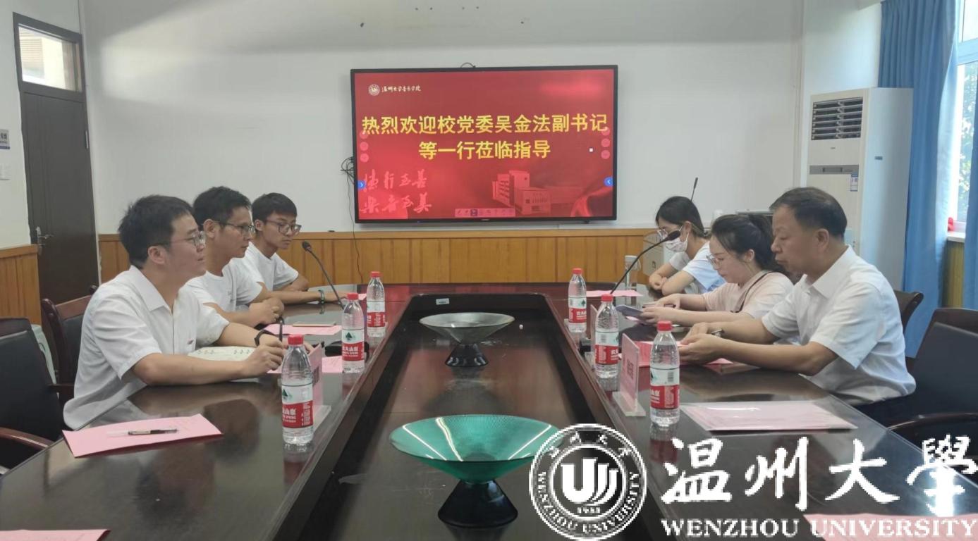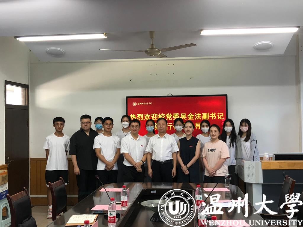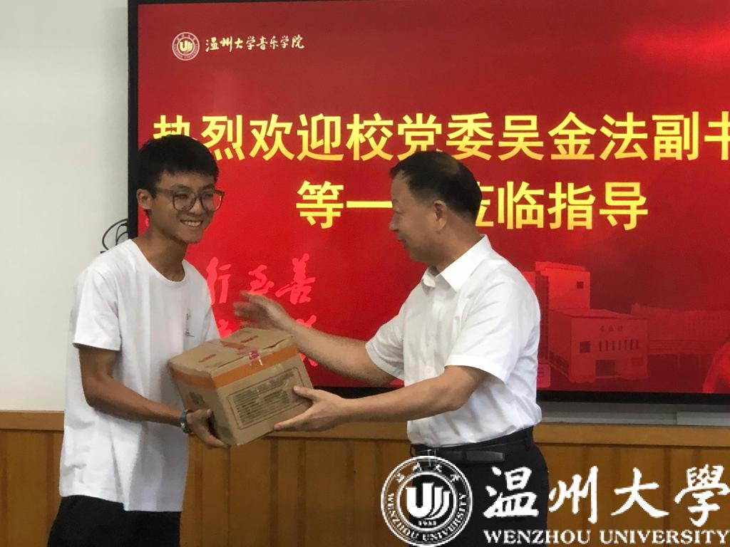 音乐教室,看望正在进行教学实践的实践队成员,并亲切问候。看到实践队的学子们认真授课,耐心的给小朋友讲解,熟练的示范,吴金法给予高度评价。随后的座谈会上,吴金法强调:音乐公益课堂暑期社会实践队是一支较为特殊的实践队,是向祖国下一代传播艺术美育的桥梁和纽带,有着以文化人、以美育人、向美而行的作用,是立德树人的根本任务全过程中的重要环节。吴金法勉励实践队师生,在实践过程中一是要守牢安全底线不放松,不仅防疫安全,更要注重自身人身财产安全;二是要坚持服务社会的导向不动摇,发扬服务精神,践行温大学子的担当;三是要坚持“知行合一”的理念不懈怠,积极践行社会主义核心价值观,在社会实践受教育,长才干。随后,吴金法向实践队学生代表送上慰问品。