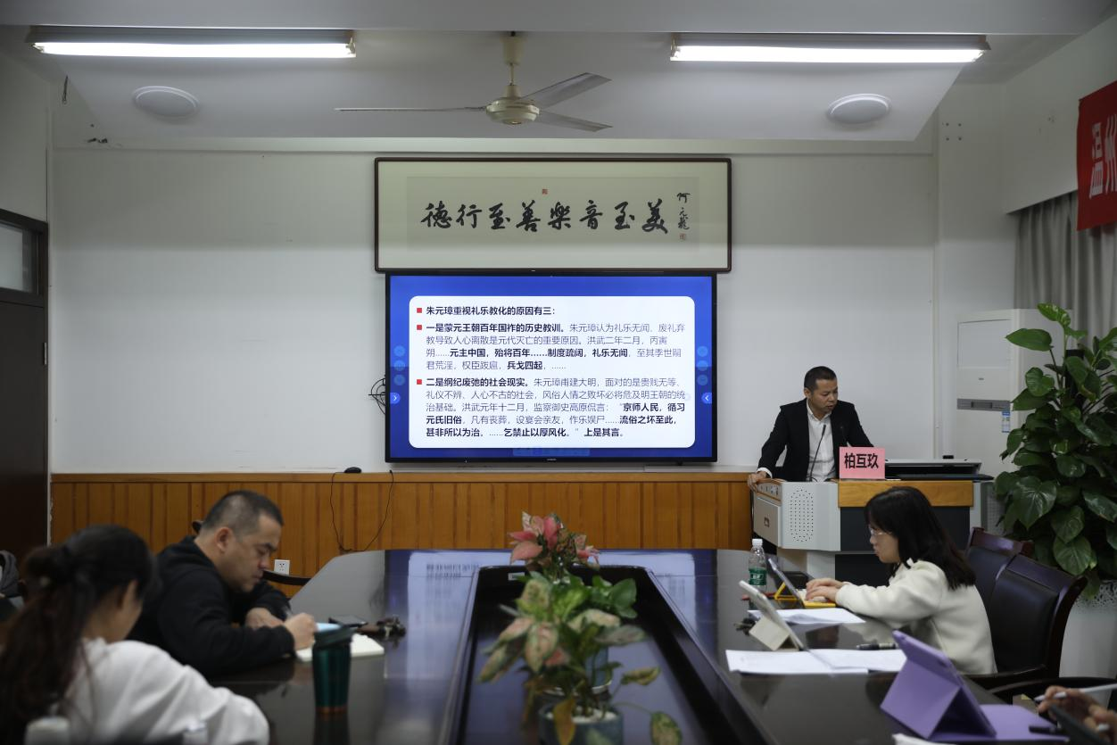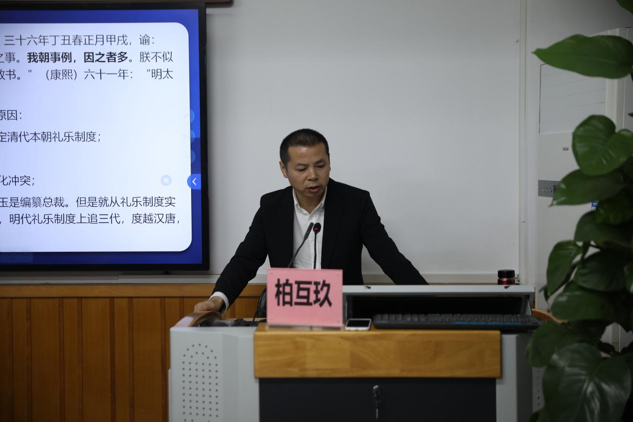 第四场,柏互玖教授的课题为《革故鼎新:朱元璋与明代礼乐社会的形成》,柏教授首先从国家礼乐制度讲起,提出朱元璋重视礼乐教化的三个原因,最后得到朱元璋从两个方面构建天下一体化的礼乐制度的观点。进而又提到学校教育制度与设礼置乐,肯定了朱元璋在制礼作乐实施礼乐教化方面的大智慧与大作为。最后得出结论:正是朱元璋从礼乐制度与学校教育两个方面构建“由礼部统辖,由太常与教坊承载”的天下一体化礼乐教化体系,最终促进了明代礼乐社会的形成。
