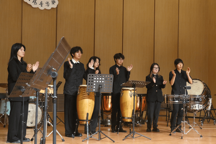 打击乐教师卢梦滢,为我们介绍打击类乐器。这类乐器常被认为是“节奏的灵魂”,它们被分为节奏性的鼓类乐器和色彩性的键盘打击乐器。为了让学生们更好的感受节奏的魅力,卢老师巧妙设计了拍手跺脚节奏游戏:台上学生以拍手跺脚形式,观众配合拍手。这个小互动用身体动作替代乐器,降低参与门槛,同时让我们了解到节奏不仅是音符的排列,更是人与人、动作与声响的共振。最后,她和学生们为我们带来打击乐重奏作品,将本场讲座的气氛推向更高。