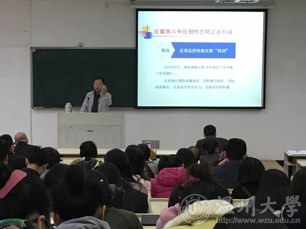 本次学习讲座,吴金法老师从党风廉政建设和反腐败斗争的总体态势切入,分析中国近年来在全球反腐倡廉的排名以及取得的成绩,以及中国公众对反腐败成效的满意度,强调国内反腐败斗争压倒性态势正在形成。同时,通过进一步分析我党十八大以来反腐态势,现阶段反腐倡廉面临的主要难点,吴金法老师引出了高校的腐败问题。高校腐败领域主要集中在以下五个领域:基建、采购、后勤服务、招生录取、学术。最后,吴金法老师对我校党员教师中存在的一些突出问题做了强调和说明,围绕习近平总书记的“要把做人做事的底线划出来”的“两学一做”学习教育重要批示,提出温大党员教师队伍的四条底线——以“忠诚”守住政治底线;以“自觉”守住道德底线;以“敬畏”守住法律底线;以“规范”守住纪律底线。强调温大党员教师必须将《中国共产党纪律处分条例》:六类违纪行为,铭记于心;“廉洁从教,立德树人”。