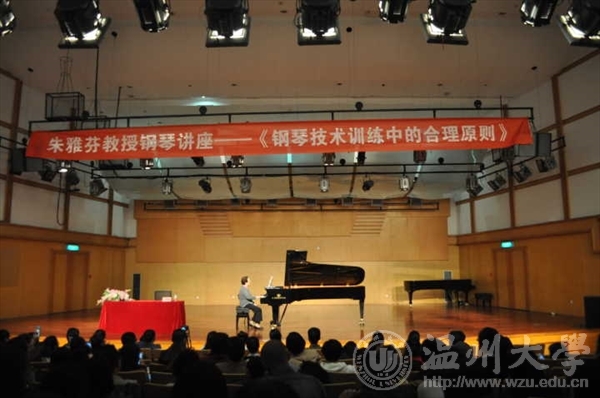 2016年11月15日晚上19:00在温州大学天瑞音乐厅开展了由著名钢琴家、教育家朱雅芬教授的钢琴讲座——《钢琴训练中的合理原则》。讲座开始之前,场下的观众席早已满座,可以想见朱雅芳教授的讲座是多么的吸引人们的眼球。