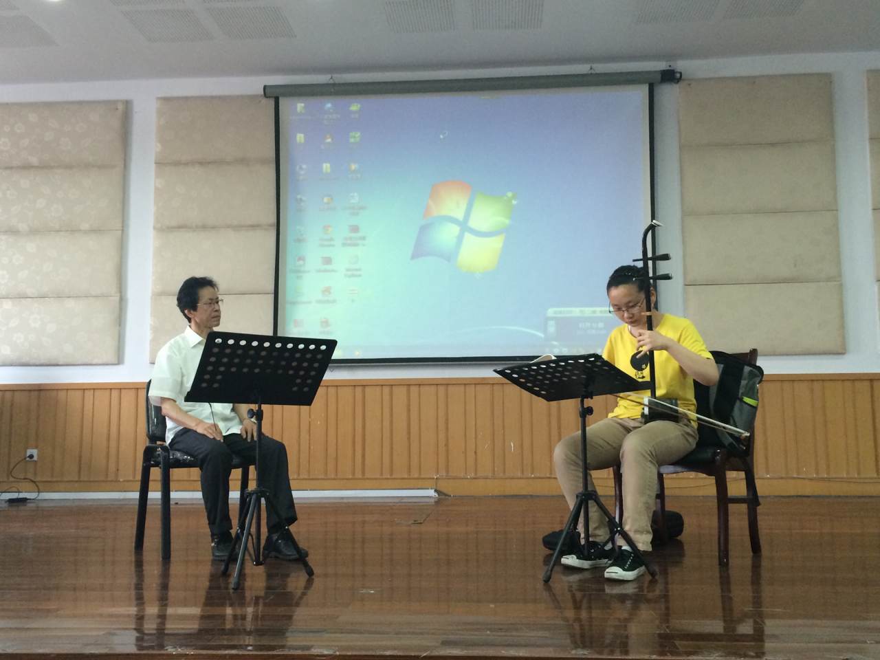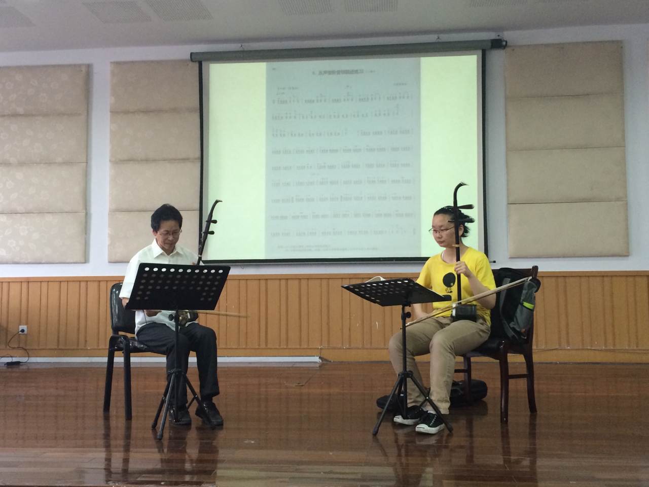 2015年5月11日上午9点50,在温州大学音乐楼201,乔志亮老师给大家上了第二节课器乐公开课。受教学生是12音表本的二胡主修学生朱玉铭同学。