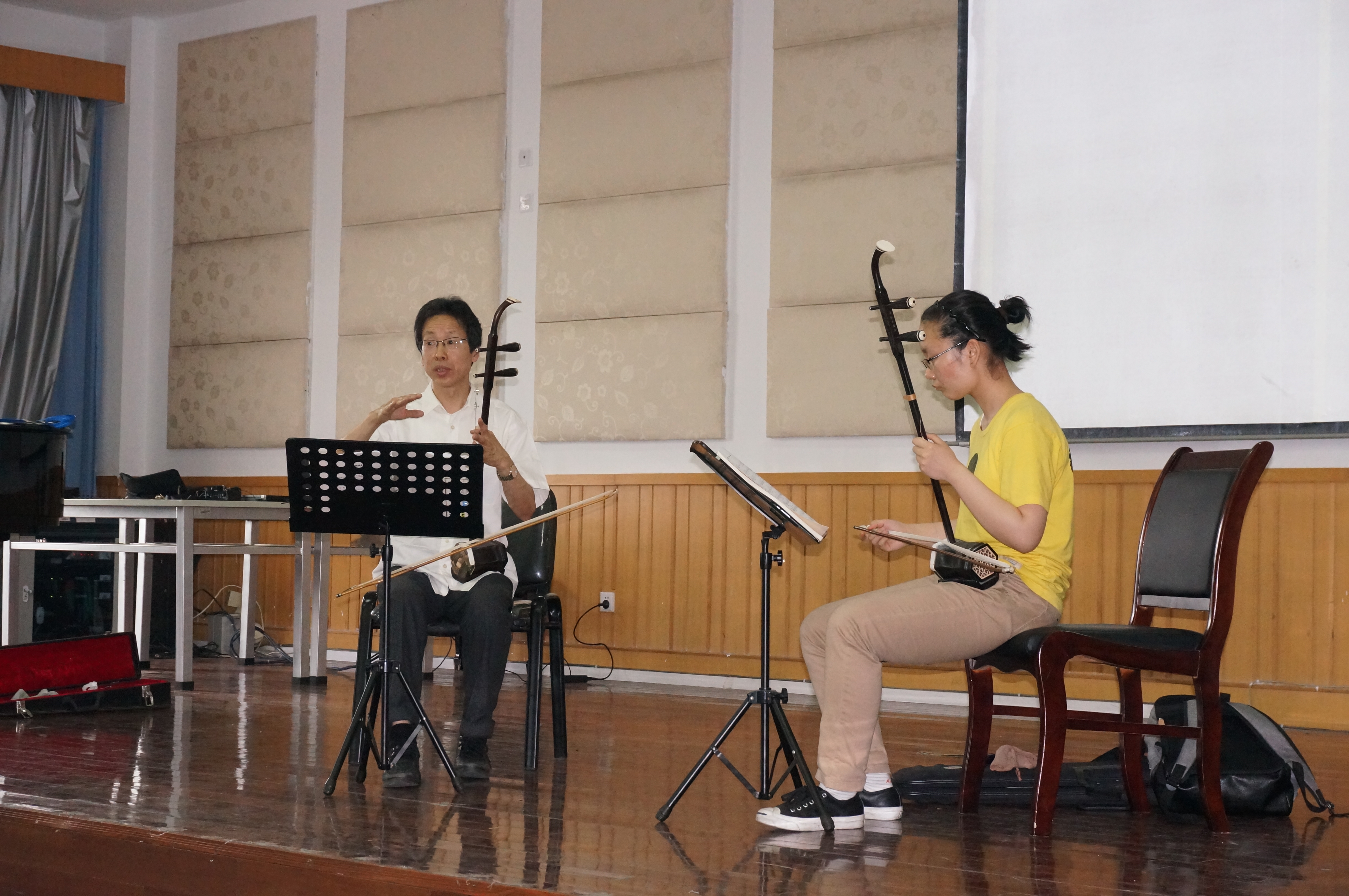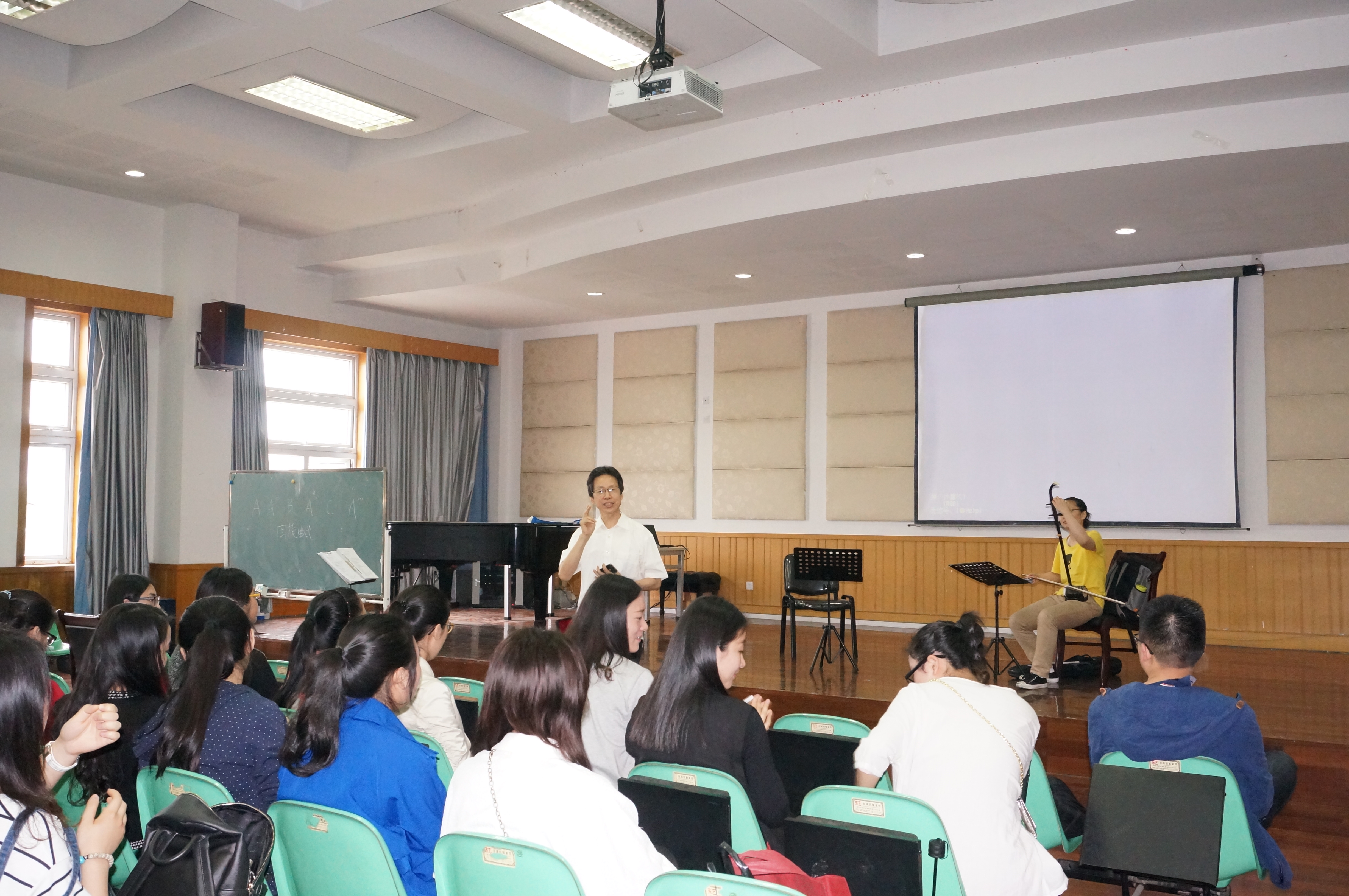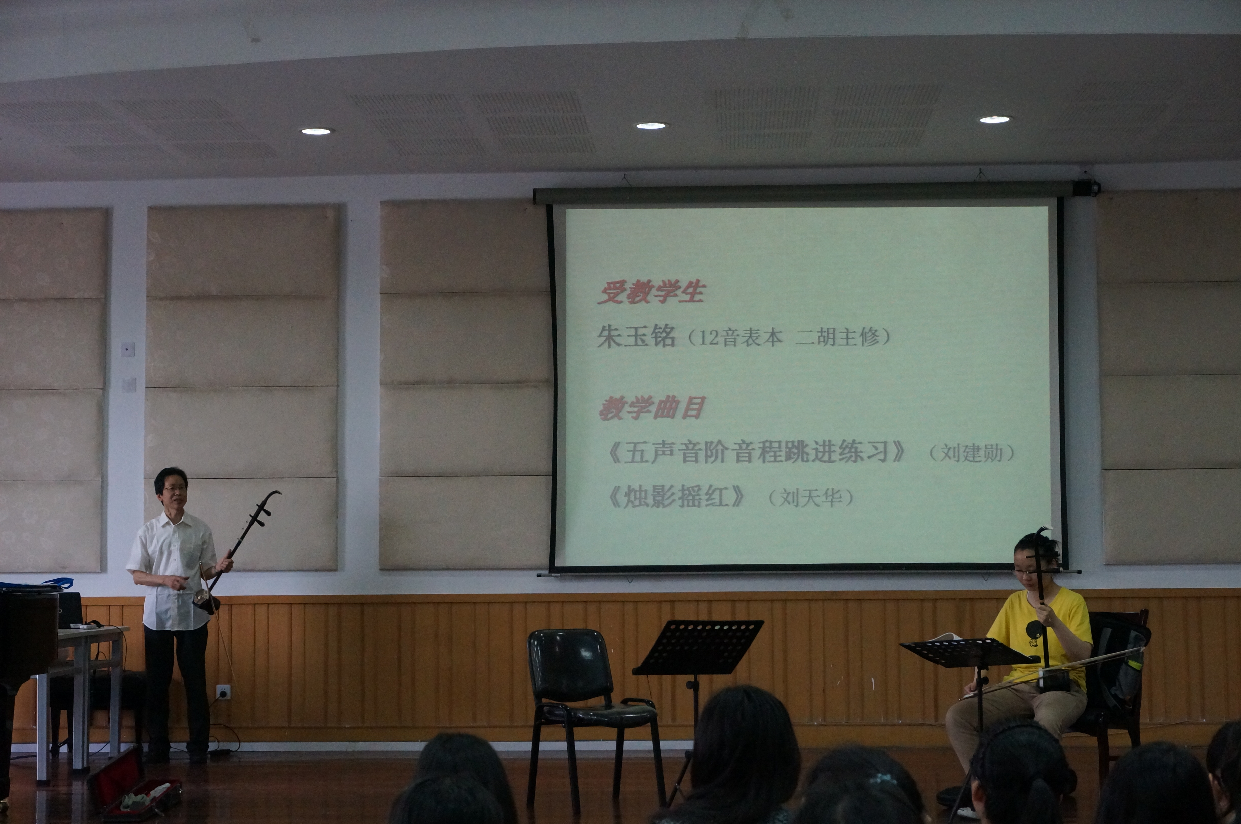 硕士生导师,浙江省优秀教师、温州大学教学名师乔志亮教授,为大家展示了一堂精彩的《二胡》课。上午10点钟不到,音乐楼201学术报告厅已坐满了等待听课的师生。乔教授为12音表班的朱玉铭同学讲解示范了刘天华先生的二胡名曲《烛影摇红》。