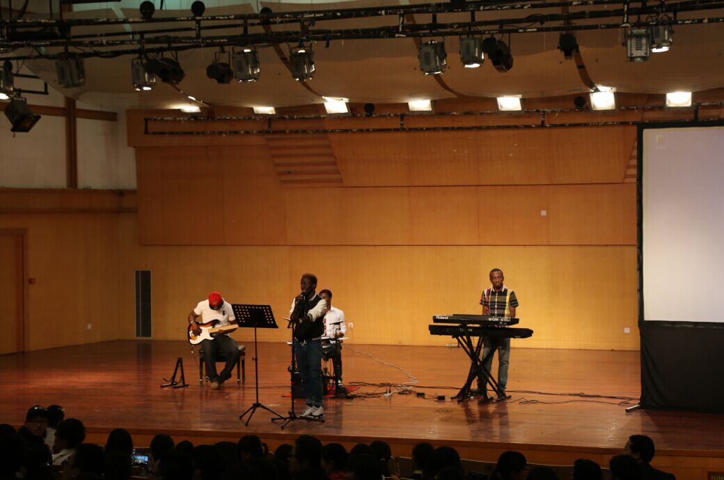富春雷副教授主讲,她为观众们请来了由温州大学和温州医学院热爱音乐的非洲留学生组成的小有名气的Soul Band乐队,观众对于这突如其来的可以亲身感受美国黑人音乐的机会感到惊喜,现场顿时High了起来。在掌声中,Soul Band乐队的四位成员面带着笑容,英俊潇洒的上了台,和观众热情地打招呼。接下来富春雷教授为大家再现了美国黑人音乐历史,源自美国黑人的爵士乐于19世纪末发祥于美国南部路易斯安那州的新奥尔良市,至今已有百年历史。直至今天,每一种爵士风格都活跃在舞台上。具有强烈持久生命力的爵士乐经过百年的演变和融合,早已突破了地域、种族和国界的局限,成为一种世界性的音乐。美国黑人音乐大致可以分为劳动音乐、宗教音乐和流行音乐三个类别。宗教音乐中最有影响的是黑人灵歌(the Negro spiritual),福音歌(gospel music);流行音乐中则有蓝调(blues)、爵士(jazz)、迪斯科(disco)等不同的品种。在这些品种中,最早出现的是劳动音乐,而最有影响的则是蓝调和爵士。Soul Band乐队为大家带来一首《Amazing grace 奇异恩典》,这首美国乡村福音歌是最初由英国牧师约翰·牛顿作词,James P.Carrell和David S.Clayton作曲的基督教赞美诗,它表达了宗教的忠诚,其中包含着一个平淡但是极富深意的赎罪的故事;接下来代表70年代的由美国著名女歌手惠特妮·休斯顿翻唱的《I Will Always Love You》与代表20世纪的由Jessie J演唱的《Price Tag》带有律动和节奏性的音乐一响起,观众们不由自主的便跟着打起了节奏,乐队主唱邀请了好友一位泰国女孩参与合唱,美妙的声音一亮相,现场氛围到达了高潮,大家纷纷拿起手机记录下这一刻,一曲唱罢,掌声雷动。Black Eyed Peas将多种音乐元素融合,创作出自己独特的hip-hop风格,由乐队带来的《where is the love》便是一个成功的代表。最后乐队献唱了Alicia Keys的《if i anit got you》, 曲调是经典的MOTOWN小调,略带沙哑的唱腔,赢得了观众的阵阵掌声。现场互动也使观众们十分兴奋,随歌而动,几位乐手演奏水平和歌声征服了全场。
