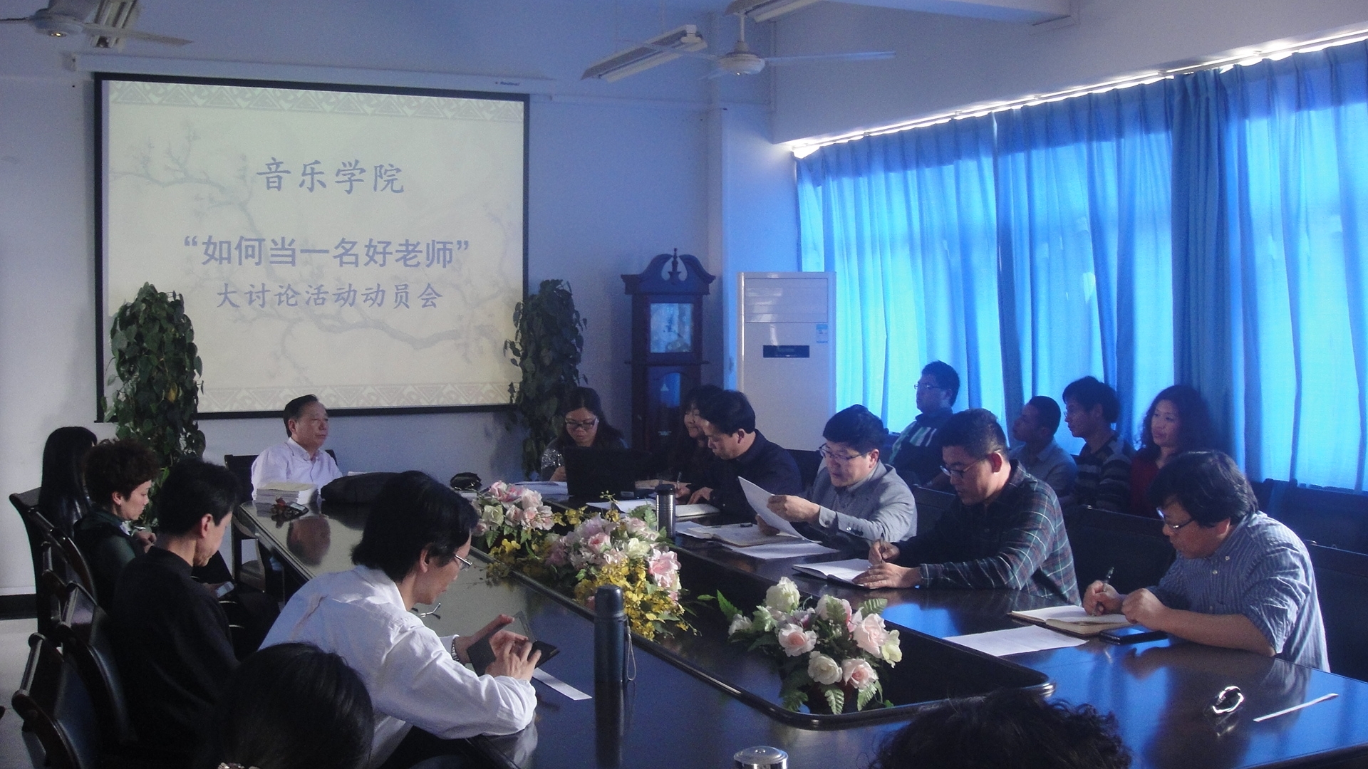 学院党总支书记刘青松同志做“如何当一名好教师”动员讲话。刘青松书记首先传达了学校关于“如何当一名好教师”大讨论活动的文件精神,他指出,这项工作是2015年学校党委重要的主题活动,活动包括动员部署、学习讨论、查摆问题、建章立制、选树典型、总结表彰六个环节。学院将在去年“教风学风建设年”活动的基础上,巩固成果,结合2015年学校工作部署,通过开展以专业荣辱观为主题的系列活动,继续开展的“如何上好一堂课”教研活动,办好音乐公开课堂,着力在“规范从教行为、提高教师素养、展示师德风采”下力气。最后,他希望全体教师能做到“三定三守”,争做一名“师德高尚、专业精湛、深受学生爱戴”的好教师,达到以教风促学风、全面提高人才培养质量、推进学院内涵式发展的目标。
