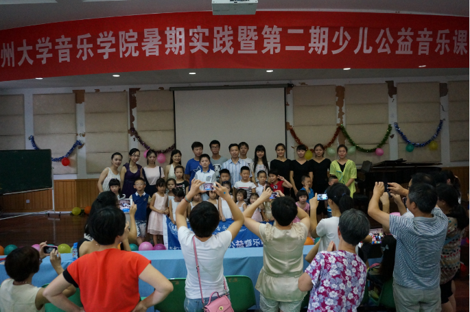展演结束后,实践队成员们给小演员们分发了礼品。最后小朋友们与老师们以及校领导合影留恋,大家的欢声笑语响彻了音乐报告厅,本次暑期社会实践也到此圆满落幕。