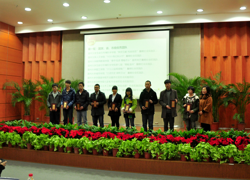 12月18日下午,2013年温州大学暑期社会实践总结表彰大会在南校雁山厅隆重举行。校党委副书记牟德刚,组织部、宣传部、研究生部、教务处、学生处、团委、马克思主义学院负责人,各学院分管书记、团委书记,受表彰的省、市级优秀团队和先进个人及部分学生代表等近300人参加会议。会议由校团委副书记熊琳主持。