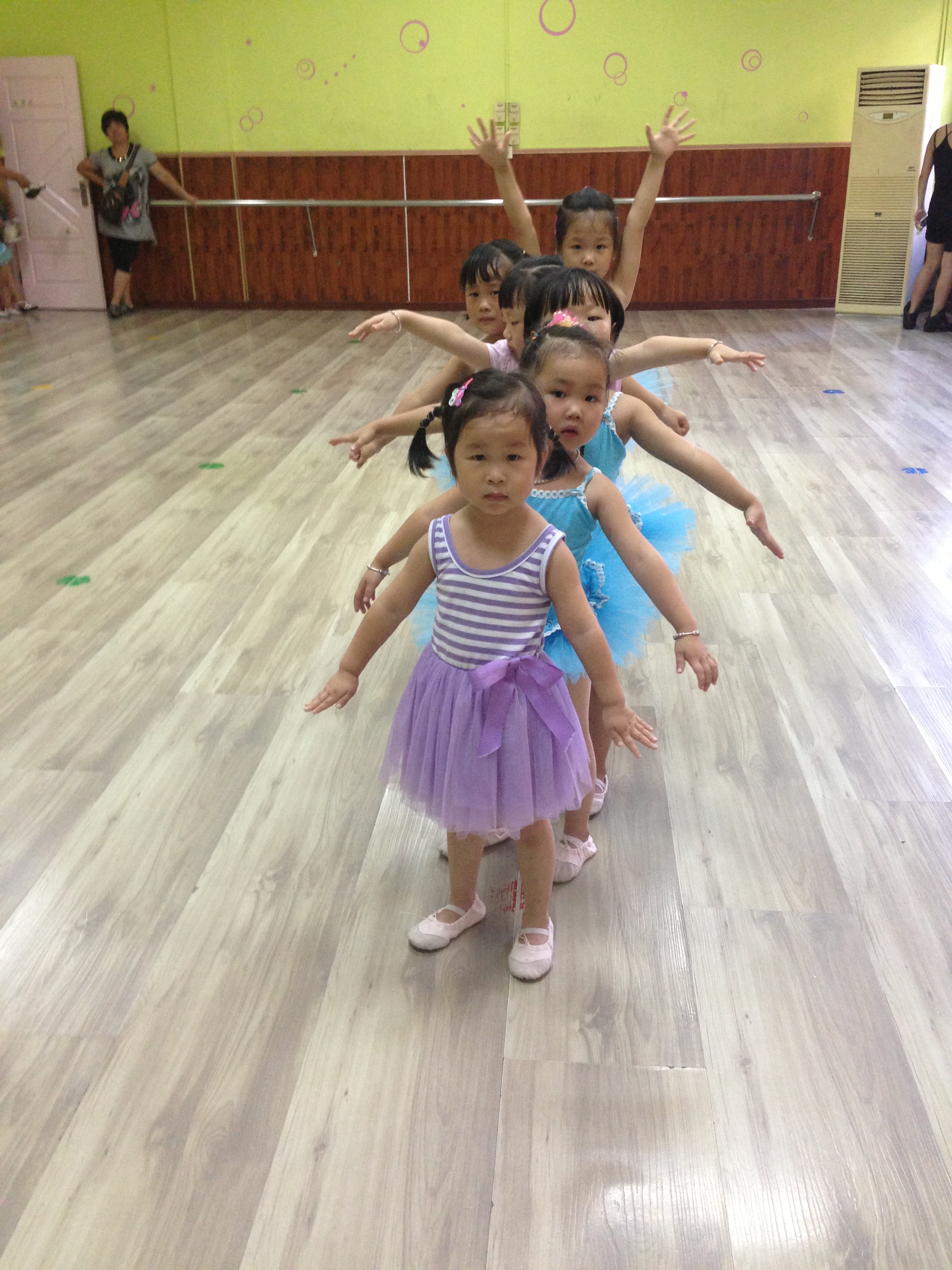下午,也有两个班,两个都是儿舞三级班。第一个班我还是照样做助教,教小朋友跳组合,帮老师放音乐等,并且学习老师是如何上课的。第二个儿舞三级的班,是我自己给她们上课,今天主要复习了之前学的动作,然后教了一个新的组合“踏点步”。小朋友们学的还是挺快的,我大概就教了两三遍,差不多都记住了,之后就是带领她们和音乐。