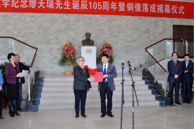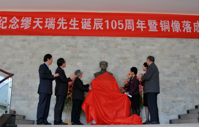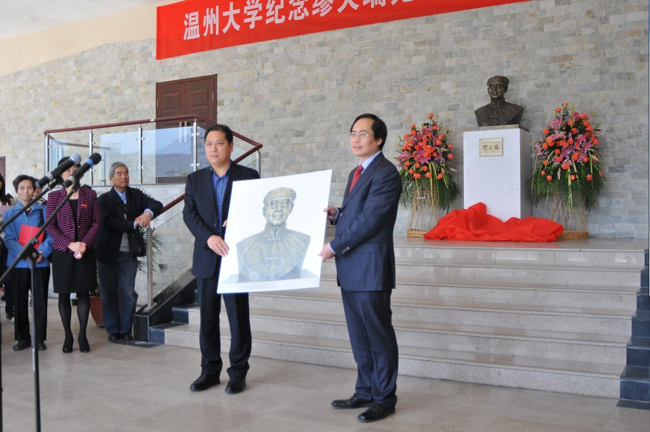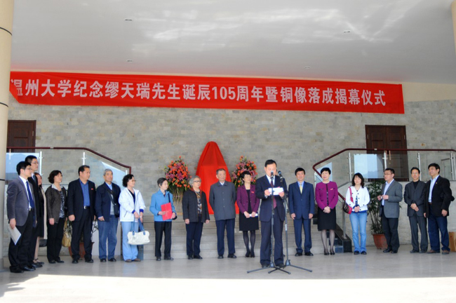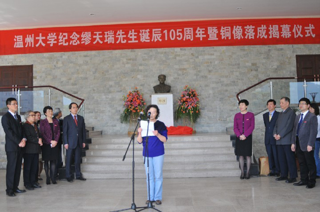 温州大学校党委宣传部部长潘玉驹主持揭幕仪式 铜像揭幕 温州大学党委副书记林娟娟教授发言 缪天瑞先生家属代表林剑女士发言 温州大学党委委员陈安金教授向天津国产成人电影 赠送缪天瑞先生铜像 院长赵玉卿教授代表学校接受天津国产成人电影 副院长方建军教授捐赠《缪天瑞文存》 学院刘青松书记代表学校接受缪天瑞先生家属捐赠先生生前编撰出版的部分书籍和相关手稿 纪念缪先生诞辰105周年学术沙龙活动 出席活动的领导、嘉宾及师生代表参观《百岁学人缪天瑞——缪天瑞先生“百年音乐人生”图片展》 合影留念