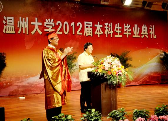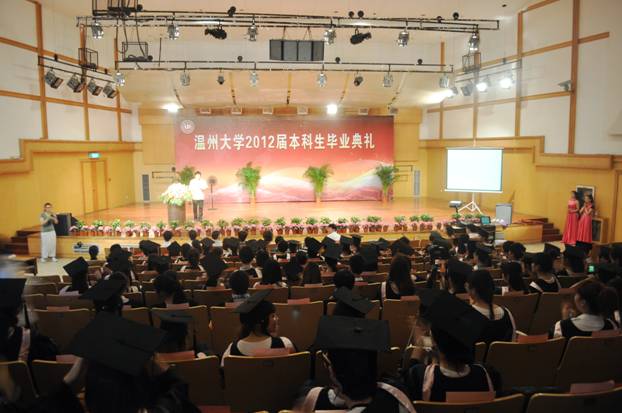 2012届毕业生毕业典礼和学位授予仪式在北校音乐厅隆重举行。温州大学学位委员会主席蔡袁强校长、院领导党总支书记刘青松、副院长李杰鹏、副院长王文韬、部分学院教师及2012届全体毕业生参加了毕业典礼。典礼由副院长李杰鹏主持。