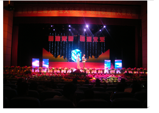 2012年5月16日晚,“唱响青春 畅想未来”温州市第三届大学生文化艺术节校园歌组合大赛(决赛)在我校大学生活动中心演艺厅拉开帷幕。温州市教育局高等教育处林成堂老师、段新明老师,温州大学团委书记杨立淮老师以及温州各高校团委老师和来自各高校的学生代表们共同观看了比赛。