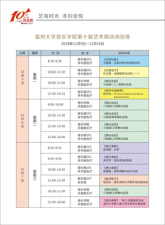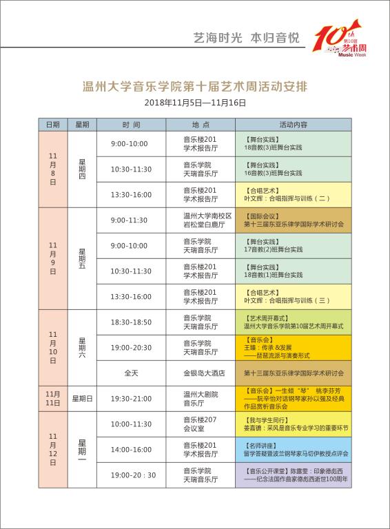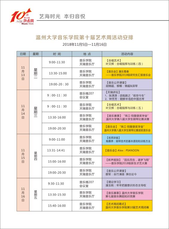 的艺术氛围、开阔学生的知识及实践视野、提高学生学习、实践的主动性、积极性,以达到百岁学人缪天瑞先生为学院题写的“切磋现代乐艺,发扬民族精华”之目标。自2009年始,一年一主题,艺术周已经连续举办了十届,很好地促进了学院的学术交流,活跃了校园的艺术氛围。