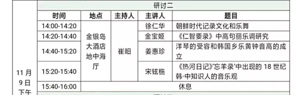 下午14时,研讨会进入第二单元,东亚乐律学会韩方会长、釜山大学崔昍教授担任主持,来自韩国釜山国立国乐院的徐仁华院长、延世大学东北亚音乐研究所的金宝姬研究员、首尔大学硕士研究生金恩智、首尔大学博士研究生宋铉椸依次进行了主题发言,釜山大学姜惠珍提交《洋琴的受用和韩国乡乐黄钟的成立》一文。