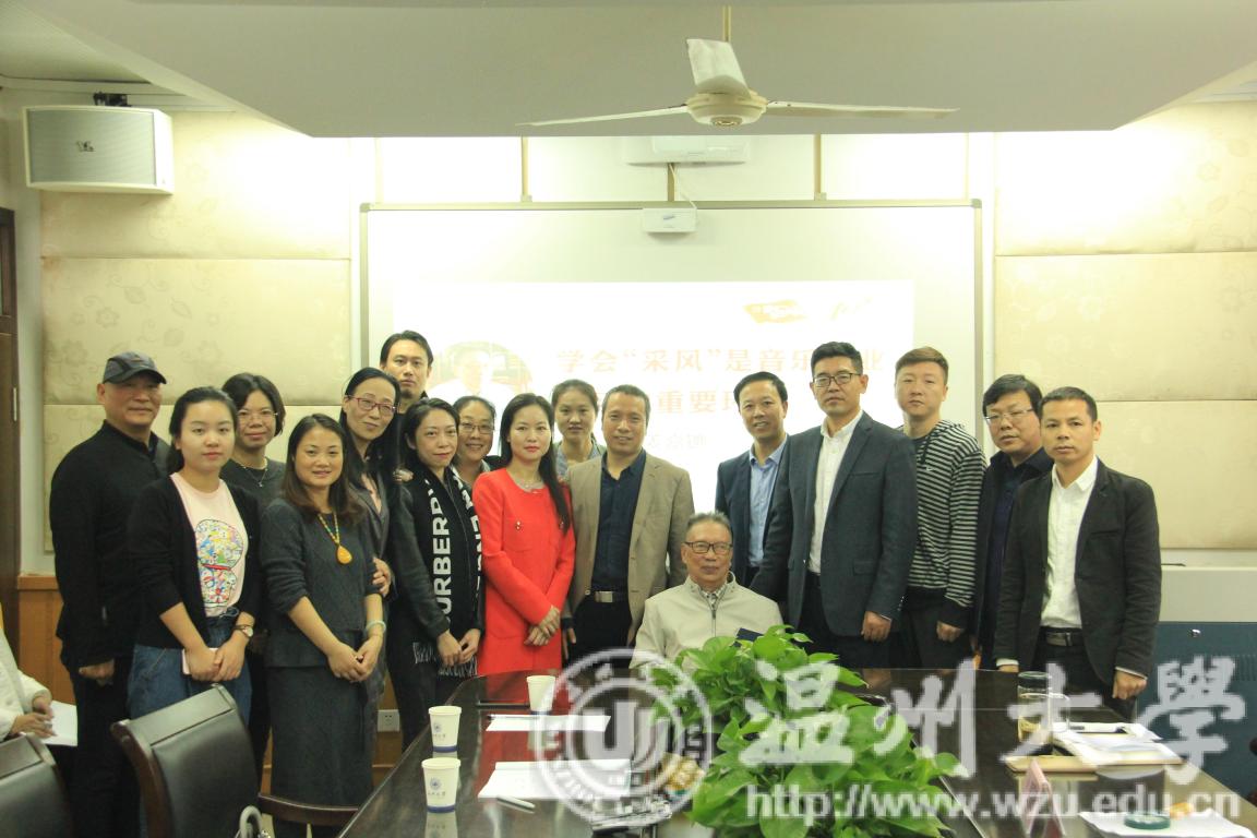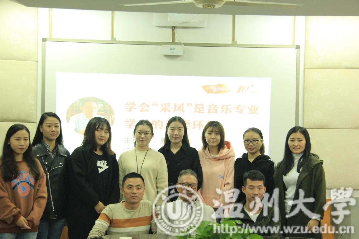 的全体老师、研究生以及本科生合影留念。正如姜嘉镳先生所说:“我又重新感受到了其乐融融的气氛。”随后,由姜嘉镳先生发言,主要向我们讲述了具有生命的歌曲都来自民间,并建议我们能够把“采风”作为一个教学环节写进教学计划。接下来,姜嘉镳先生为我们介绍了温州民歌的种类,例如:乐清山歌、永嘉山歌、瑞安童瑶以及瑞安对歌。这些民歌素材都值得我们去采撷。此外,姜嘉镳先生还向我们介绍了温州方言,并认为温州方言是我们温州的活化石,与普通话不同的是:它不仅有八个声调,还保留了古代最原始的汉字发音。