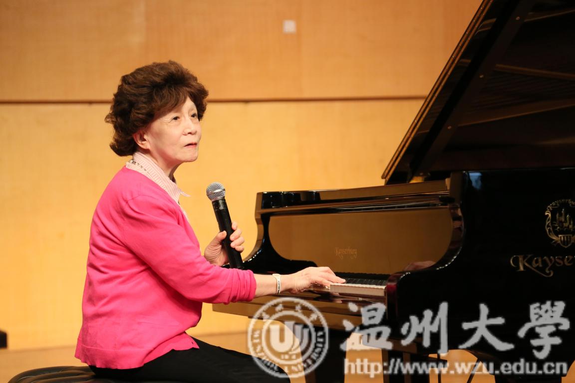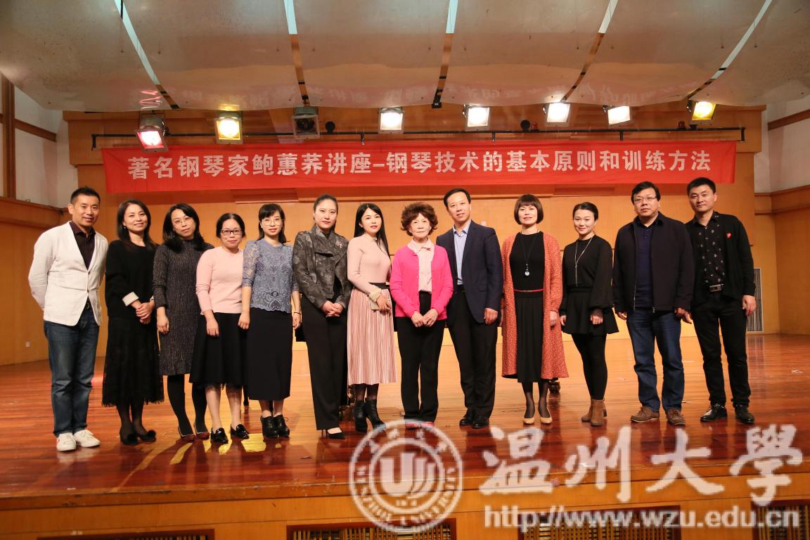 首先由赵玉卿院长为鲍蕙荞老师颁发了客座教授聘书。鲍蕙荞老师表达了对温大师生的感谢,随后便开始了主讲。首先鲍老师提出学习钢琴是一个漫长的过程,提出要脑子思考,意识与听觉相结合的观点,着重讲解了对神经的训练,强调意识在前,要让听觉引领练习,演奏。鲍蕙荞老师结合自己的亲身经历与经验,告知师生们所有的演奏,首先要了解乐器的基本原理,再由浅入深。紧接着鲍蕙荞老师提出技术与发音的原理密切相关的基本原则,分别从下键的高低,力度,速度,角度,横向移动,旋转式移动和手指移动的部位等方面进行阐述。鲍老师着重对于入门时需注意的各方面进行了详细的讲解,从身体协调性,坐姿,自然与放松等方面展开阐述,并提到了我们要利用当前庞大信息量的优势,针对当前浮躁的问题,强调了要由浅入深,循序渐进的重要性,并提出作为一名钢琴老师不要急于造星的观点。随后对“练习曲要不要每一条都弹”的问题进行剖析,鲍蕙荞老师的回答是基本上都要弹,并且要科学的弹。鲍老师将学习过程比喻成建造房子的过程,只有把各个技术环节搞明白,先慢后快,打好地基,最后才能建造出美丽的房子,最后鲍蕙乔老师提出高抬指训练是一种方法,手段。分别从慢练,启动快,下键速度即触键速度快,还原快即放松快等方面进行了详细的阐述。最后,讲座在鲍蕙荞老师的寄语中完美落下帷幕:希望各位师生在掌握基本原则后,结合自身情况,钢琴水平得到提高。