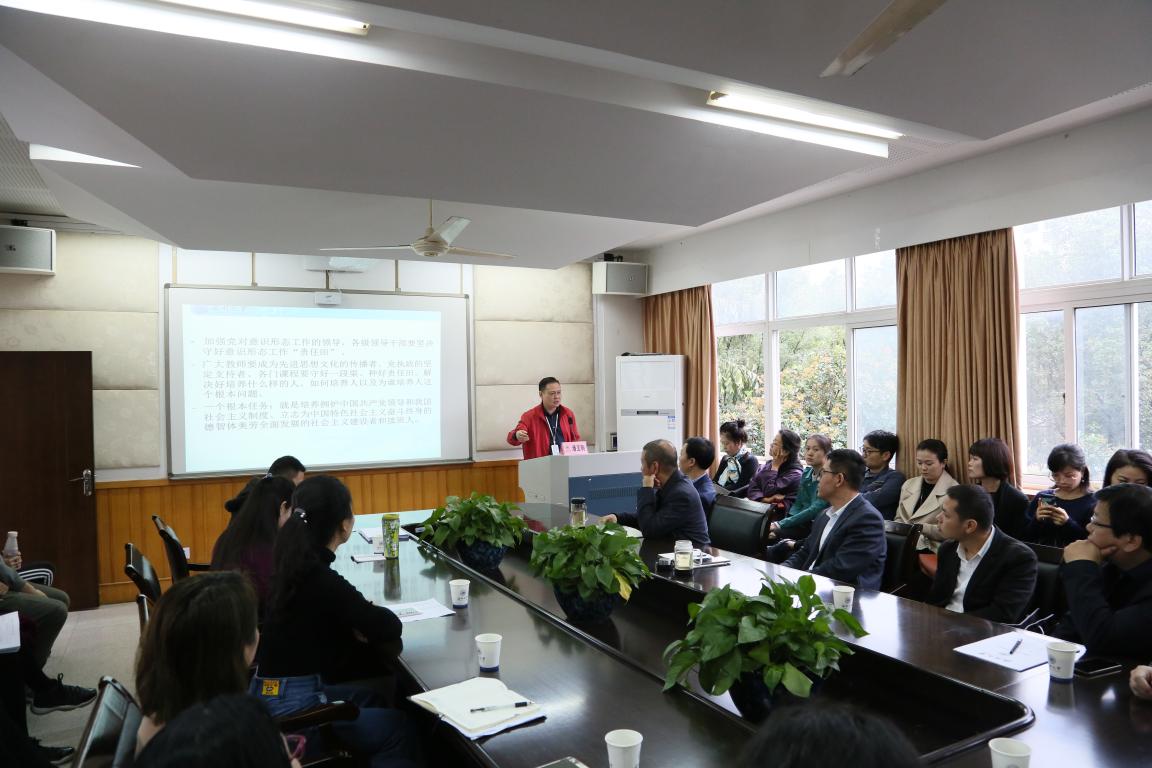 207会议室举办了意识形态教育讲座。此次讲座邀请到学校党委宣传部部长潘玉驹,并作了题为《牢牢把握意识形态主导权》的专题讲座,会议由学院党委书记方建敏主持,全体教职工、党员参加了讲座。