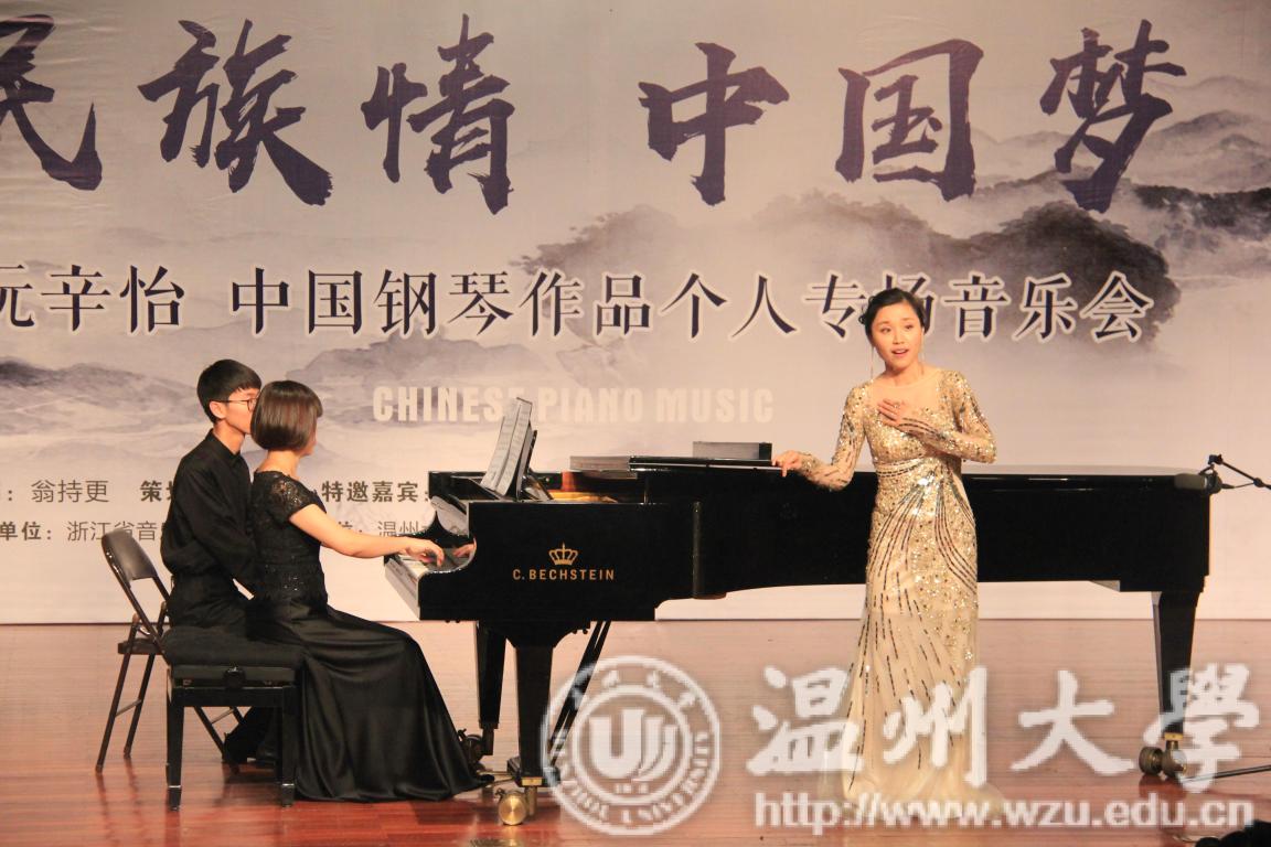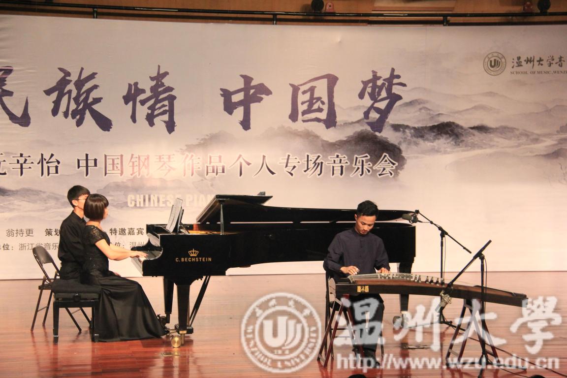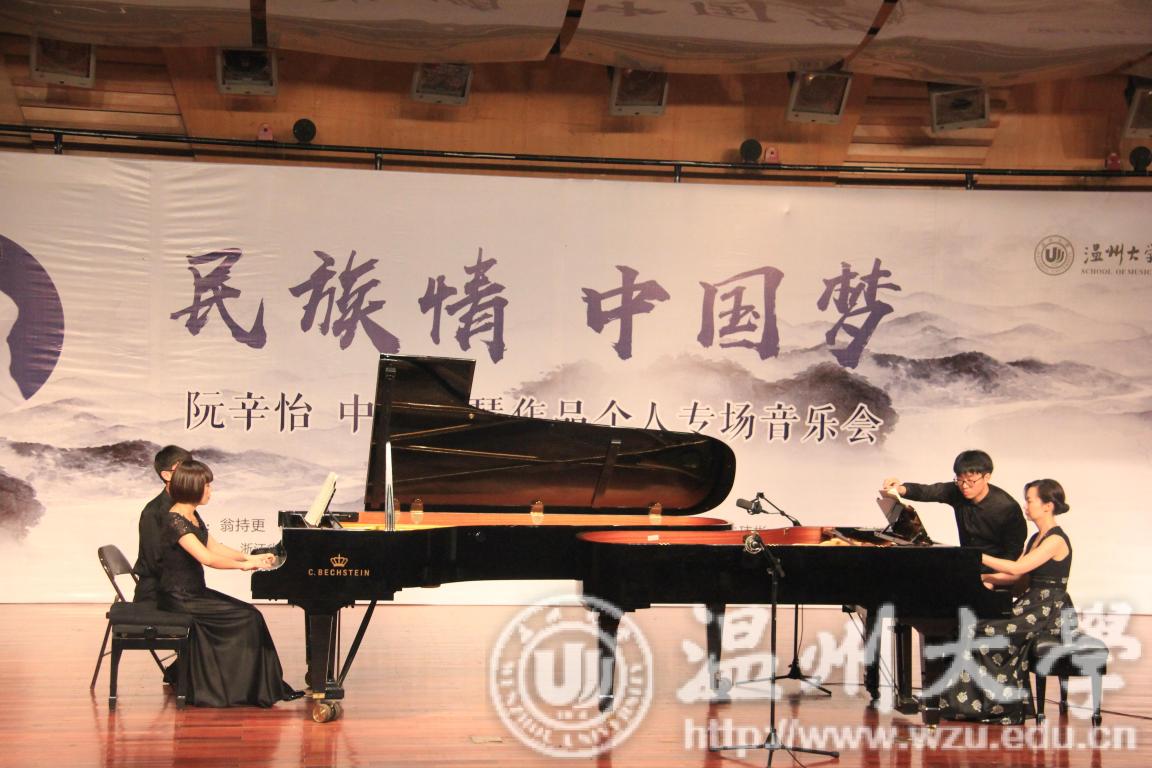 自己的学生,还有一位是来自国际教育学院的外国友人。他们用双语为我们介绍了每一首曲目。接下来,两位主持人为我们请出了今天的主角——阮辛怡老师。第一首,阮辛怡老师为我们带来的是《杂技速写》组曲,这首组曲分为空竹、走钢丝、转碟、玩球、踢毽五个部分,每一个部分都风格迥异,以生动的音乐形象带我们观赏了中国最纯正的杂技表演。这部组曲让我想起了俄罗斯作曲家穆索尔斯基的《图画展览会》,以"漫步"为主题,贯穿整部音乐。每个画面都给了我们充足的想象空间,风格各不相同。可以说,两部组曲有异曲同工之妙。第二、三首作品,阮辛怡老师为我们带来的是钢琴曲《思春》以及大家十分熟悉的《浏阳河》。两首作品,深深地吸引的大家,现场萦绕着钢琴曲,仿佛将我们置身于"音乐仙境",观众们如痴如醉。接下来两首作品是《谷粒飞舞》和《春舞》,《谷粒飞舞》为我们描述了农民们丰收时的情景,作品中也完美的运用钢琴模仿了机器运作时的声音。《春舞》也描述了丰收时的场景,只不过这次我们来到了美丽的新疆,为分享着在丰收时人们美好的心情。这两首作品之后,阮辛怡老师又为我们带来了《中国之梦》,这首作品吸收了古琴的演奏风格,真正体现了中西合璧的特征,为我们描述了一幅梦幻般的、神圣壮丽、秀美的画面。进入今晚音乐会的下半场。不同于上半场的独奏,下半场以合作形式为主。首先是一首《渔舟梦晚》,这是一首钢琴与古筝的合奏曲目。将一山、一树、一水、一舟,一一的呈现在我们眼前。钢琴、古筝仿佛化作巍巍高山与潺潺流水,带我们领略着中华的高山流水。这就是中华之美,诗情画意、含蓄而又如此酣畅淋漓。这之后是两首声乐曲目《爱人送我向日葵》、《小鸟,我的朋友》。演唱者以深情的演唱为我们演绎了两首作品,感情强烈直击听众的内心。尤其是后一首作品,最后结尾部分的花腔衬托着主人公内心的思绪,技巧十分高超。可以说真正达到了了欲哭无泪的境界。再加上阮辛怡老师的伴奏与之烘托,情感拿捏也就更加到位。接下来是双钢琴曲目《中国西部组曲》,分为引子、蒙族民歌、藏族民歌、苗族民歌四个部分,带我们欣赏各民族间不同的美。今晚的最后一首作品是四手联弹《翻身的日子》,这首作品表达了在土地改革后,农民们生活发生了翻天覆地的变化之后,十分激动、喜悦的内心情感。