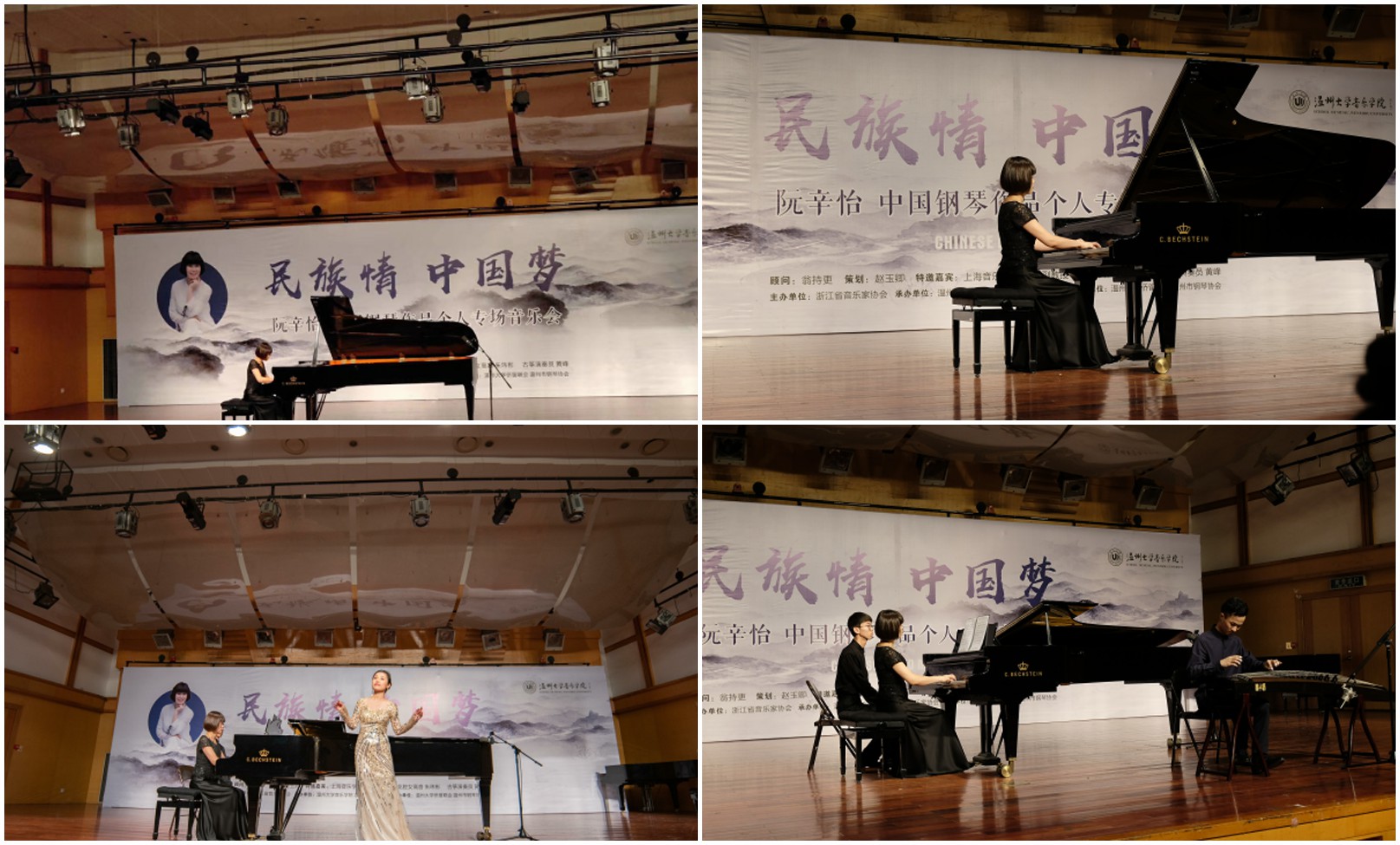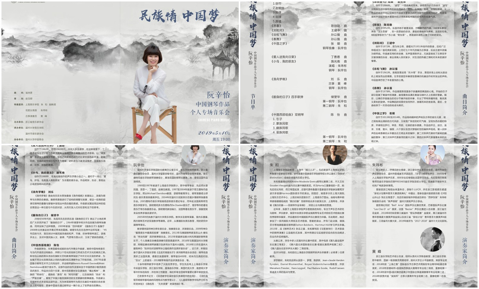 本场“民族情 中国梦”音乐会上阮老师独奏演绎了多首中国经典钢琴作品,如黎英海的组曲《杂技速写》,从阮老师琴声中可以反映出作曲家所要表达的宛如中国水墨画中的诗情画意和中国民族特有的优雅气质。耳熟能详的《思春》《浏阳河》以及孙以强先生作曲的《谷粒飞舞》《春舞》。《春舞》作品中浓郁的新疆风格,在阮辛怡老师优美柔和的钢琴声中,犹如置身于美丽果园,而欢快热烈的旋律犹如新疆人民载歌载舞庆祝丰收的喜悦。2014年由张朝作曲的《中国之梦》,阮老师的演奏让观众感受到高远清新的古代风韵,又有宽广恢弘的时代气魄,呈现东西合璧的特质,并表现出梦幻、神圣、秀丽、壮美的音乐意象。