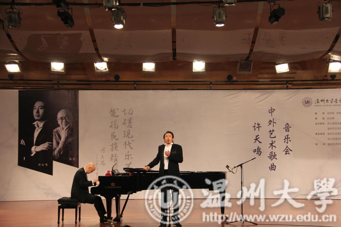 首先,主持人为我们介绍了今晚的两位主角,许天鸣老师以及石音老师。紧接着,为我们介绍了开场的几首曲目。本次音乐会分为上半场和下半场。上半场,由中国艺术歌曲组成。一首《思乡》作为开场曲,在许天鸣老师和石音老师相辅相成的配合下,一开场就将全场观众们的热情点燃。使原本就座无虚席,甚至有些拥挤的音乐厅,变得更加的火爆。这之后,许天鸣老师还为我们带来了许多耳熟能详的艺术歌曲。例如,《大江东去》,豪放雄健却又感时伤逝。《教我如何不想他》情景交融,平静而又带着淡淡的忧伤。一首《钗头凤》作为上半场的结尾曲目,凄婉而又伤感。下半场是外国艺术歌曲专场,以德语和法语为主。包括德国艺术歌曲《乌鸦》和《死神与少女》。以及法国艺术歌曲《心醉》、《悲歌》、《秋日》、《摇篮》、《遨游》。每一首歌曲在许天鸣老师的演绎下,都显得十分动情。每一个细节都牢牢地抓住观众们的心。在许天鸣老师演唱时,全场鸦雀无声,而在每一首歌曲结束时,观众们都会献上雷鸣般的掌声,安静的音乐厅瞬间变得燥热起来。不知不觉,演唱会已经进入尾声,而观众们却还沉寂在歌曲的美妙意境中,显得意犹未尽。最后,许天鸣老师和石音老师在一片热烈的掌上中谢幕,并感谢到场的每一位观众。