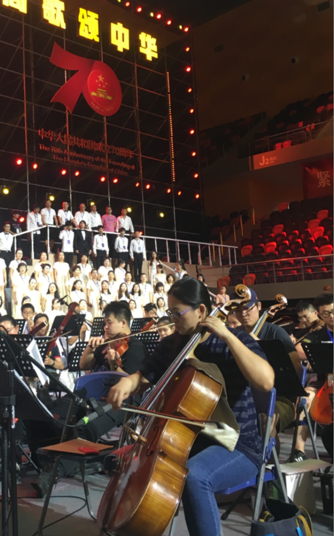 的教师们:乐队小提琴首席蒋乐乐博士和大提首席是赵光雯博士。