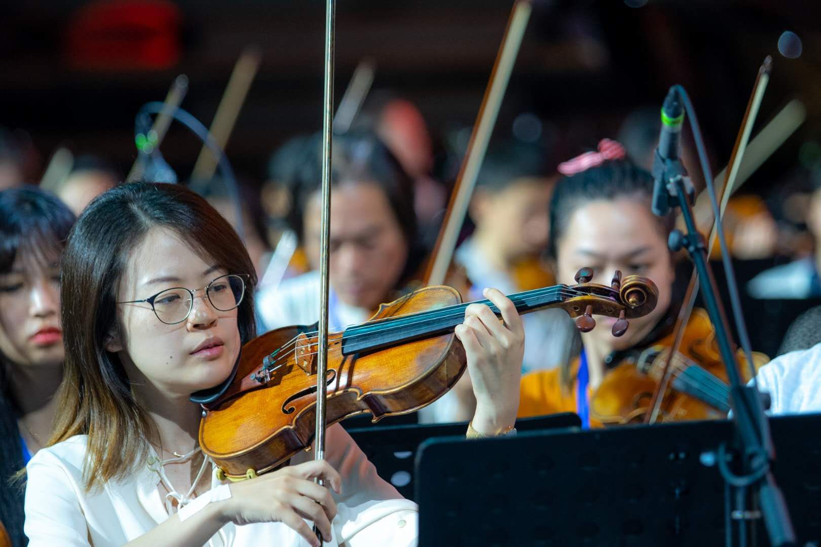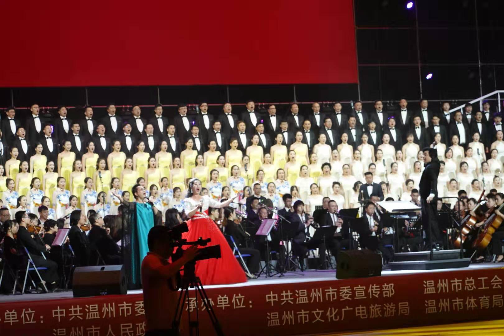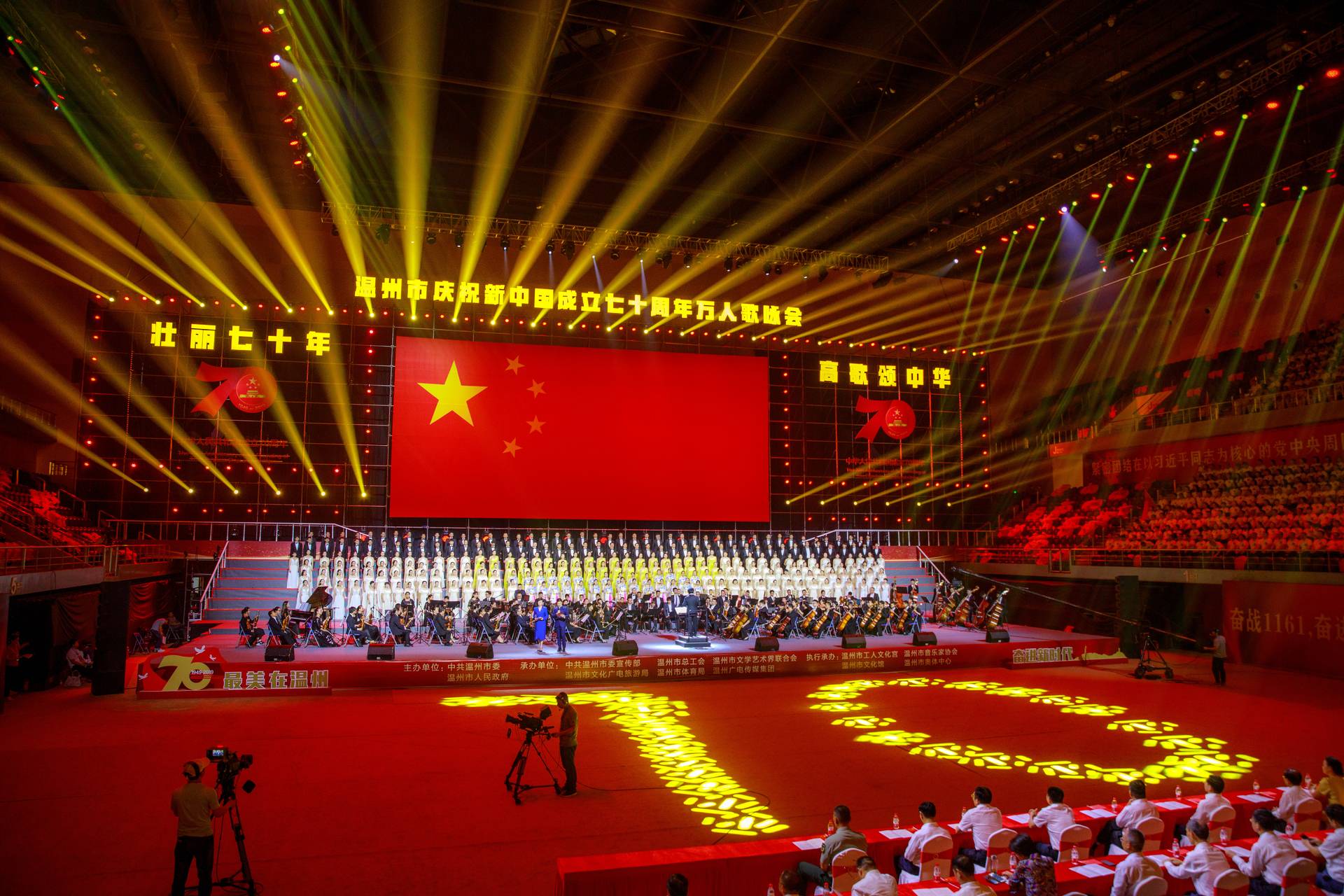 9月26日晚,温州市奥体中心体育馆歌潮涌动。“壮丽七十年 高歌颂中华——温州市庆祝新中国成立70周年万人歌咏会”在这里恢宏唱响。由温州名家艺术团、温州大学室内乐团、温州市青少年交响乐团组成的温州市市民交响乐团的130名成员,和来自温州市合唱团、鹿城区女教师合唱团、温大学生合唱团、瑞安市合唱团的310位演员在主舞台精彩亮相。环形看台上,形成黄、白、粉、绿、军绿等18个彩色方阵,人们手中挥舞着红旗,脸上笑容洋溢。一个半小时里,22首满载爱国激情、抒发幸福情感的经典歌曲,经重新编排配器精彩呈现,彰显出瓯越大地歌颂祖国、歌唱家乡的热血情怀。