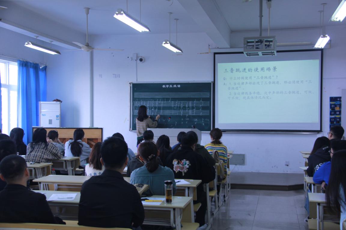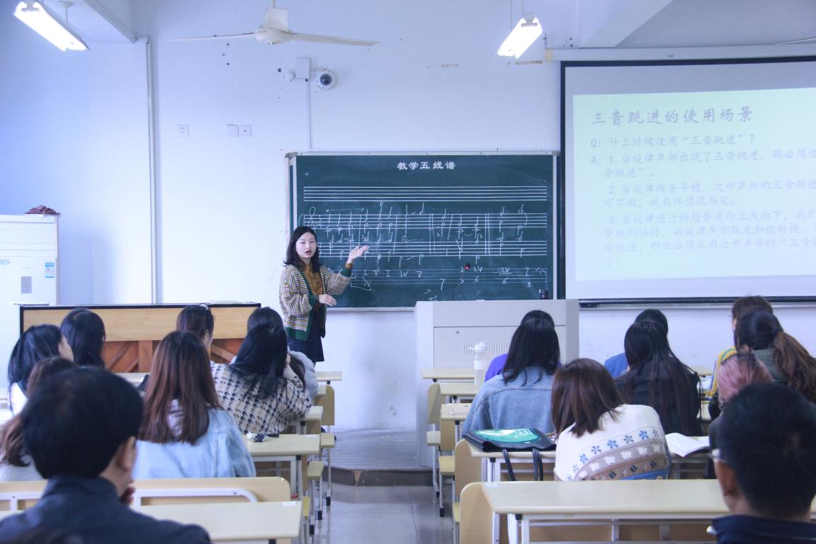 旭日初升,同学们很早就到达了外语楼406教室,虽然同学们都早已大致了解了这节课的内容,但热情与期待依旧洋溢在他们幸福的面庞。郑博士,是同学们甚为喜爱的老师,所以这场公开课的气氛很是轻松活跃。在课堂上,郑博士讲解了关于三音跳进的思考及相关知识。本次课堂的创新性是一大亮点,师生间的互动非常频繁,老师富有逻辑性与趣味性的语言吸引着在场的所有人。课程时间非常短暂,但浓缩的都是精华。认真的讲解充分展现了郑博士的专业性,学生们专注的眼神与挺直的腰板诉说着学生们对于这节课的热爱。现场数位院领导和专业老师到场旁听,本次课程结束后他们在公开课研讨会上对郑博士的讲课进行了具体的分析。