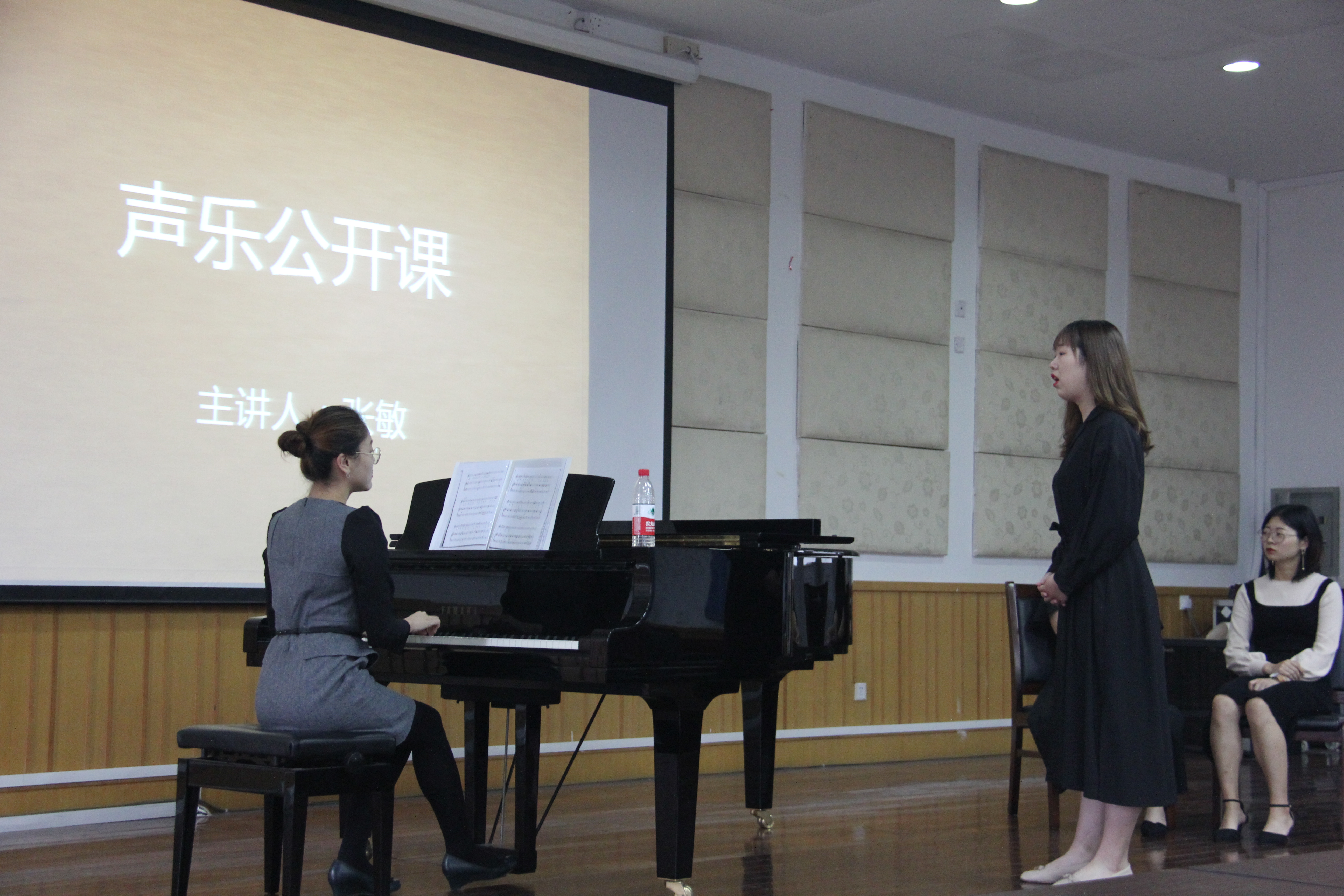 本次公开课张敏老师主要以日常上课方式进行。张敏老师先是帮助三位学生练声,然后仔细的分析学生的问题,并亲自演示使学生更清晰的了解自己的问题后再加以解决,在学生找到正确发声方法时也会大加称赞。这种引导式与鼓励式的教学方法能让学生们更直观的知道如何能唱的更好并且更有自信去歌唱,教学过程充分展现了张敏老师的专业性。虽然课程时间短暂,但是张敏老师简单明了的讲解与亲身演示相信也会使三位学生收获满满。