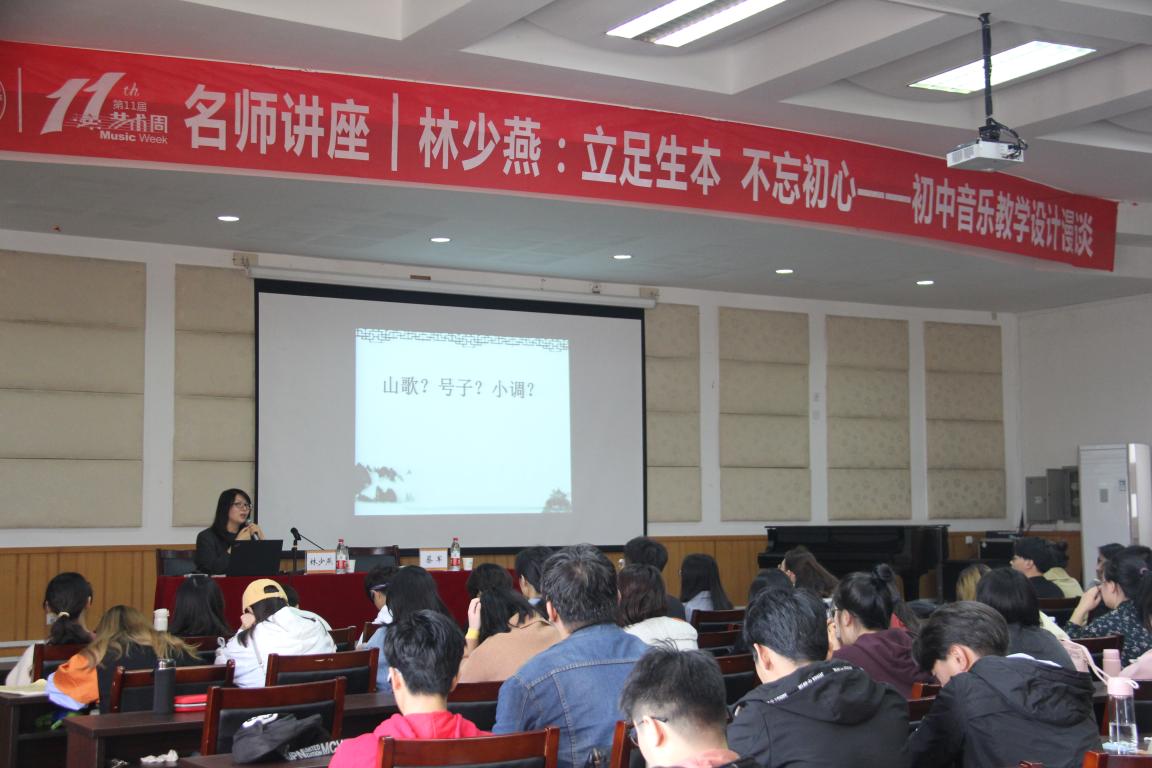 2019年11月8日,我们有幸邀请到了林少燕老师来做主题为立足生本,不忘初心——初中音乐教学设计漫谈。林少燕老师,中学高级教 师,温州市教坛新秀,任教于温州市绣山中学。曾多次荣获浙江省及温州市中小学生艺术节优秀指导师称号。同学们都对于此次讲座表示热烈的期待。