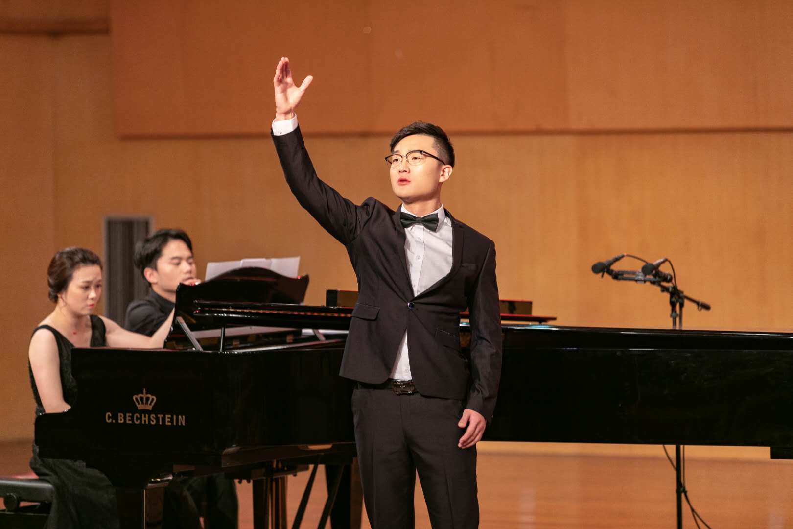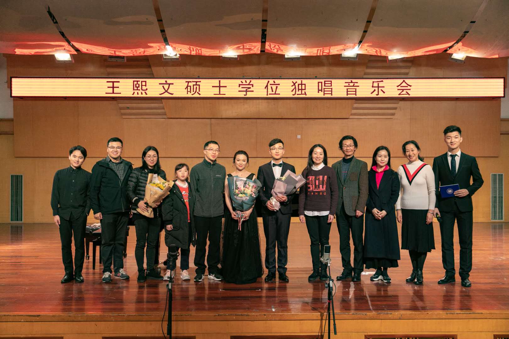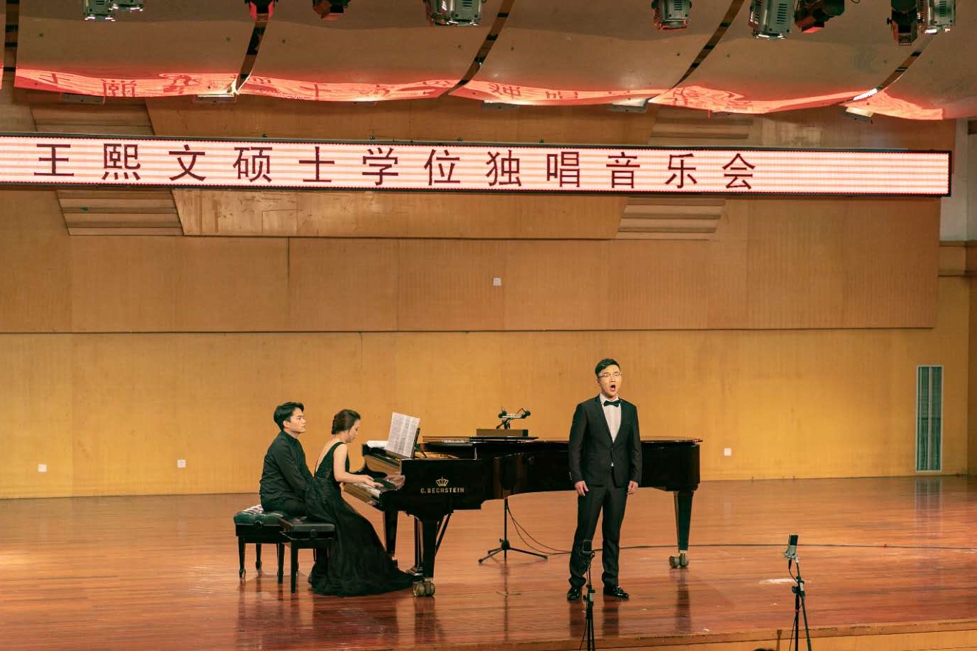 晚7点是由王熙文同学演唱的第二场。他也演唱了12首中外作品。不仅仅有中国“艺术歌曲”的开山之作,我国著名音乐家青主创作的《大江东去》、也有陆在易先生根据于右任的诗词《望大陆》创作的艺术歌曲《望乡词》、还有意大利作曲家卡里西米所做的一首康塔塔中的独唱曲《胜利啊,胜利》、莫扎特的歌剧《费加罗的婚礼》中的一首男中音咏叹调《你想要跳舞,我的小伯爵》,最后以一首《师恩如歌》结束整场音乐会。