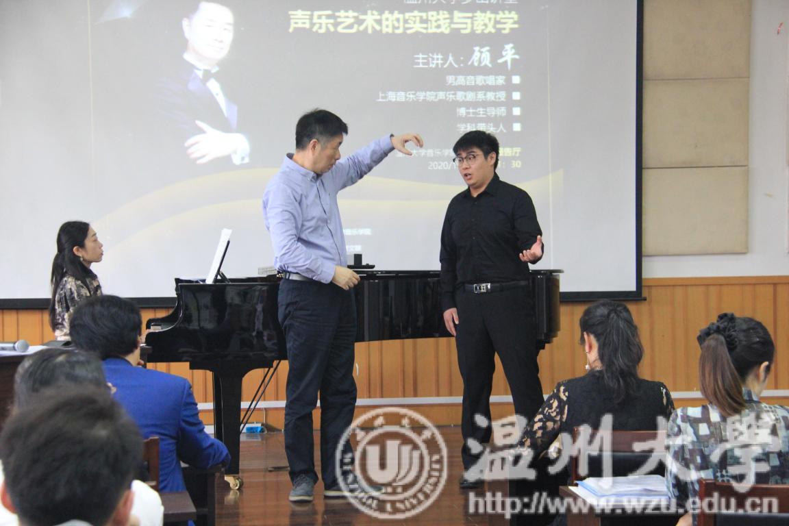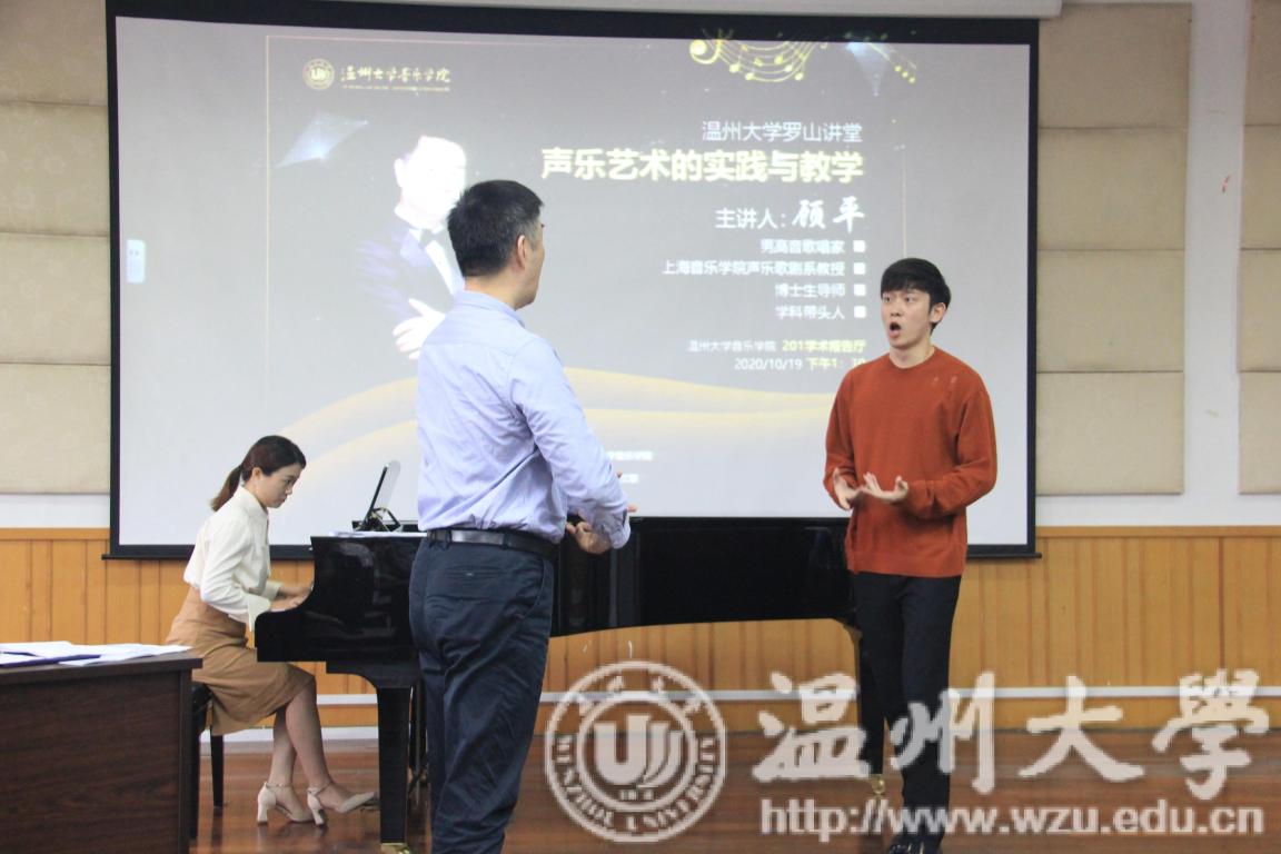 的师生、专家、温州大学教师发展中心的青年教师以及温州市区音乐爱好者纷纷前来学习,全场座无虚席。讲座采取一对一教学指导的方式,更直观地展现声乐的魅力,方便大家的理解。顾教授分别在声音、语言、情感、舞台表演等方面对学生进行了专业地指导教学。